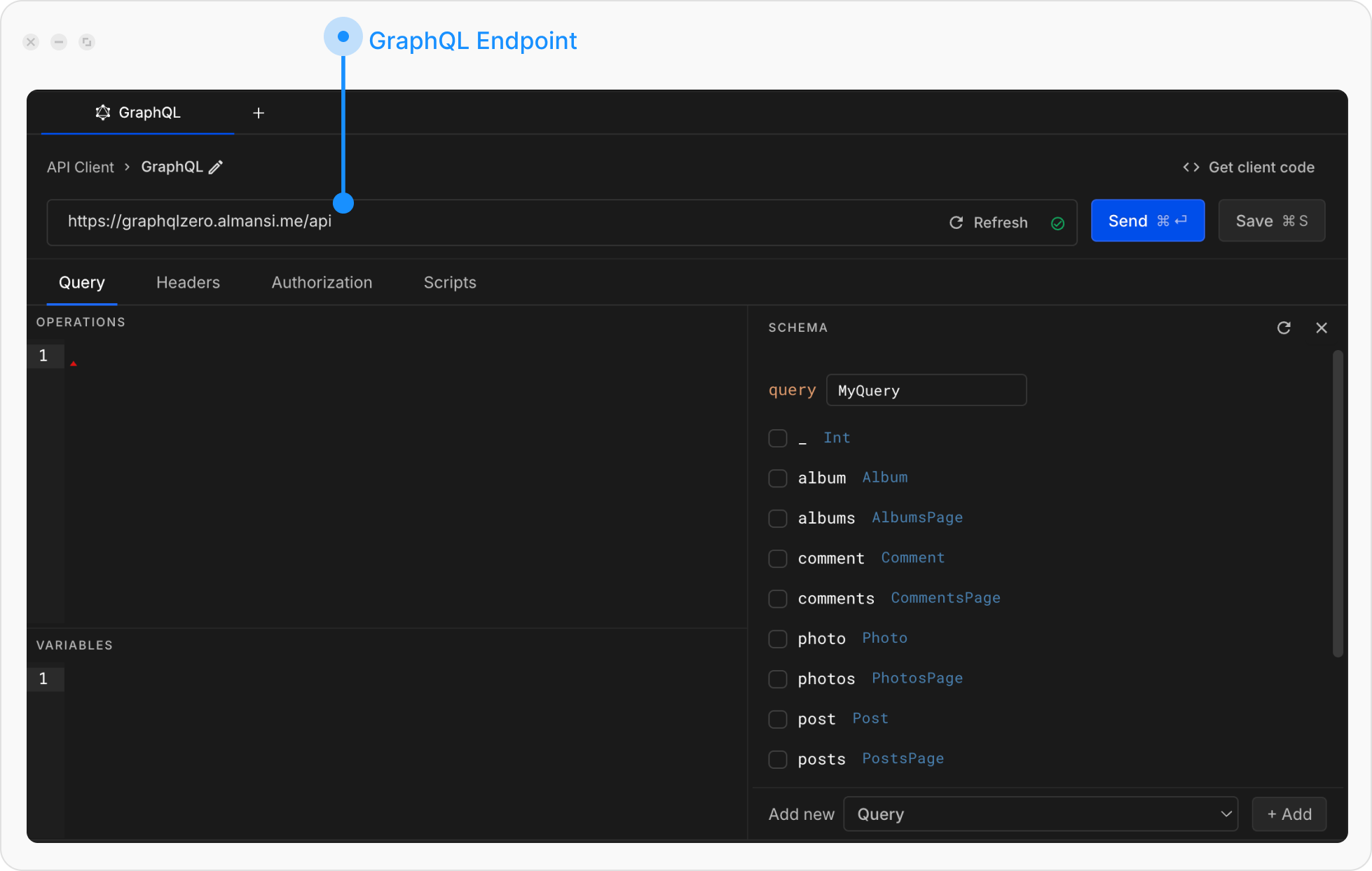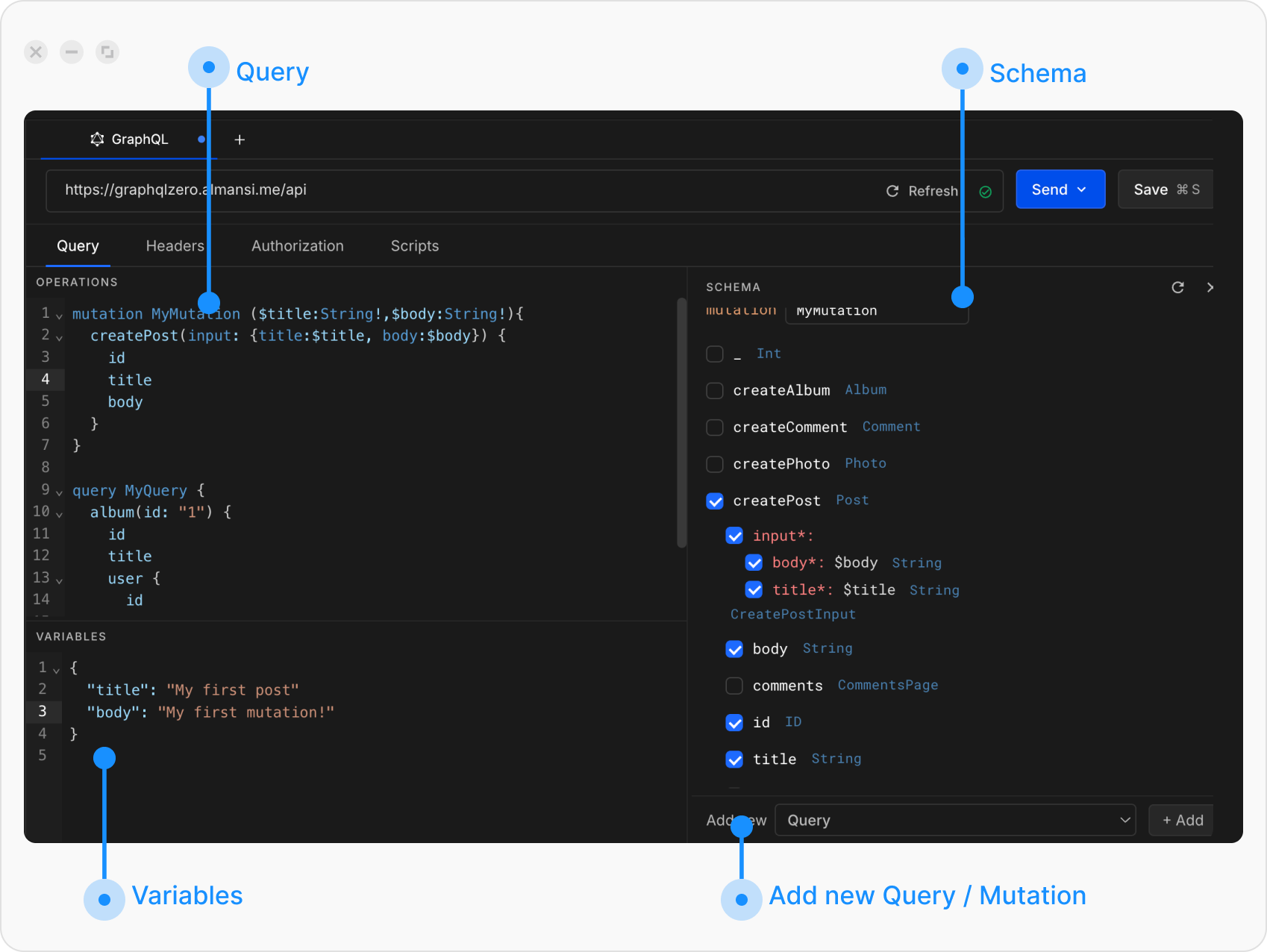 - Schema: where you explore your API’s schema (Queries, Mutations, Subscriptions).