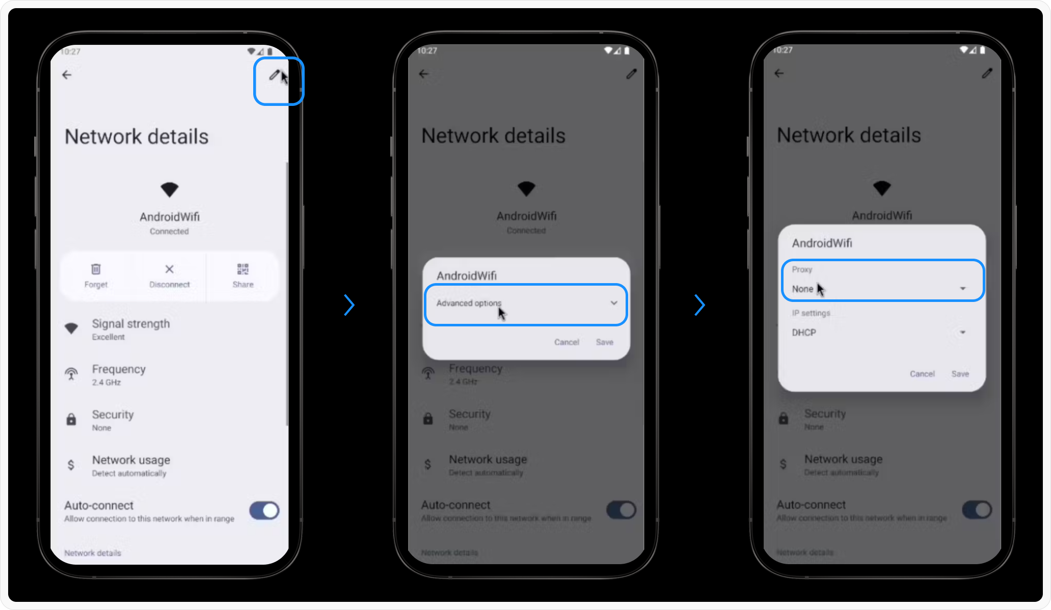 If the automatic setup does not work for you, you can manually configure the proxy by following these steps: If you have ADB installed, you can skip the proxy setup through the emulator’s UI by running the following command in your Android studio terminal:Select Network: