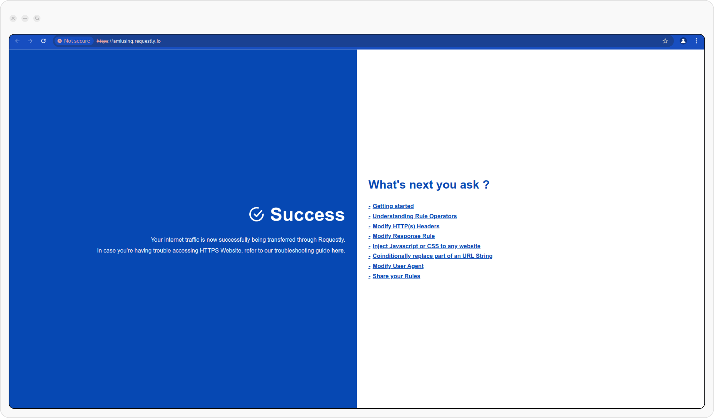 The newly launched browser instance will automatically open amiusing.requestly.io. A success message on this page confirms that the browser is using Requestly’s proxy.