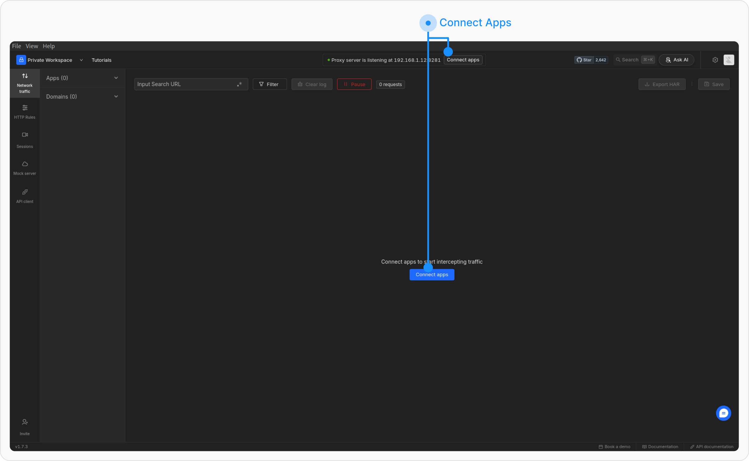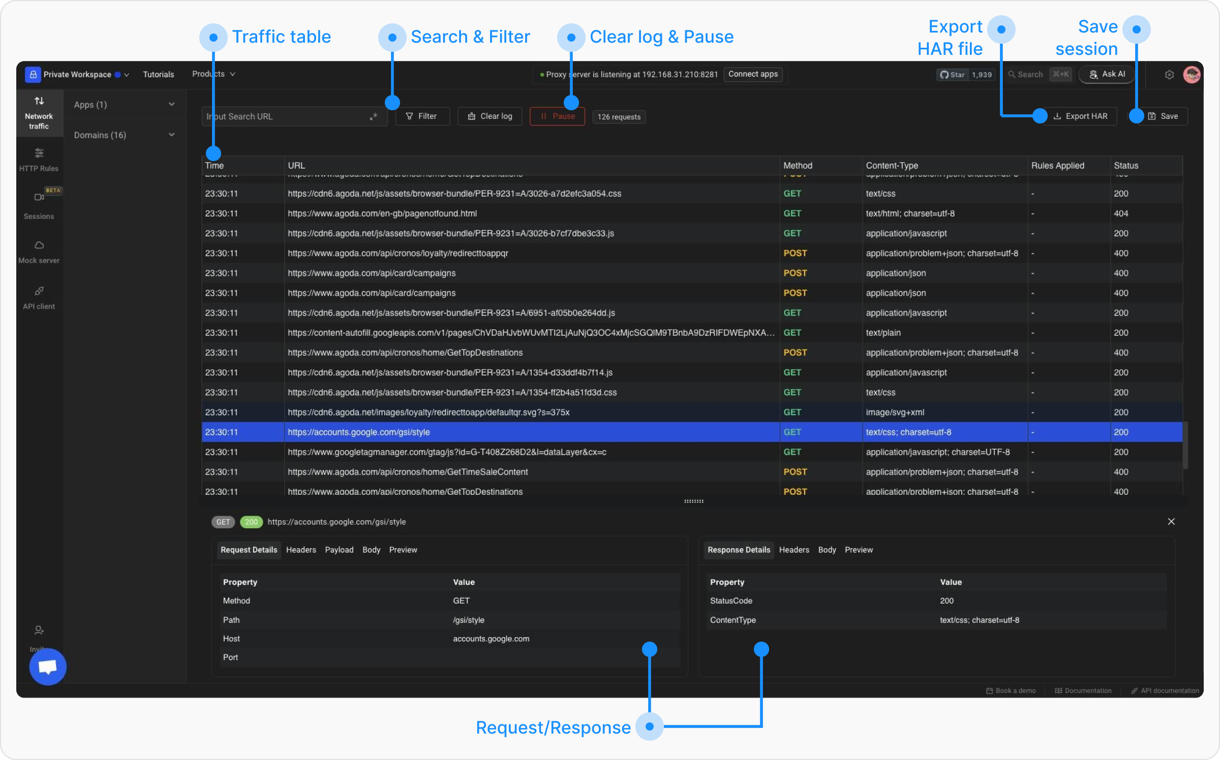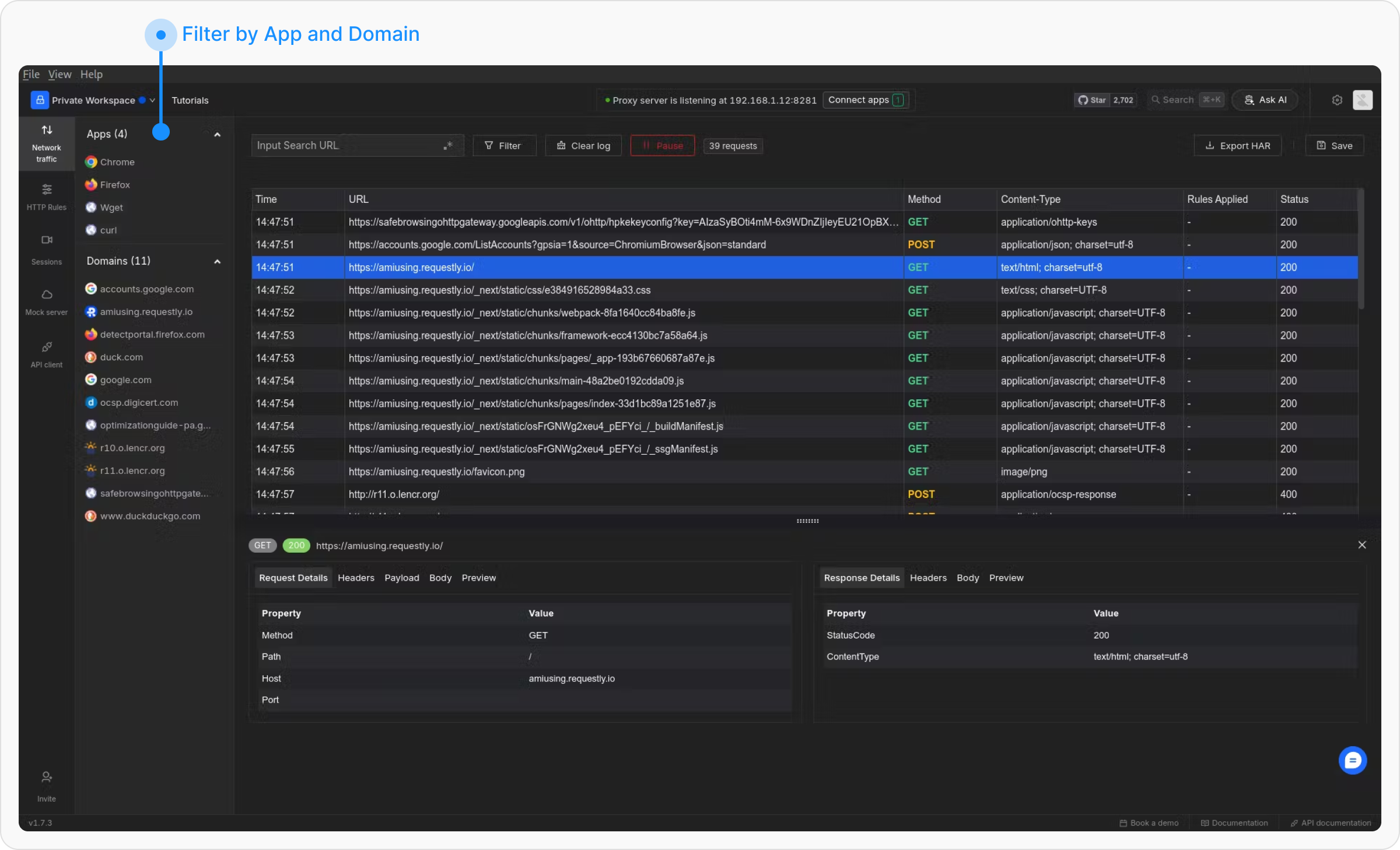 Once the system-wide proxy is enabled, network traffic will start appearing in the network table. You can click on any request to view request and response details, setup rules, etc.