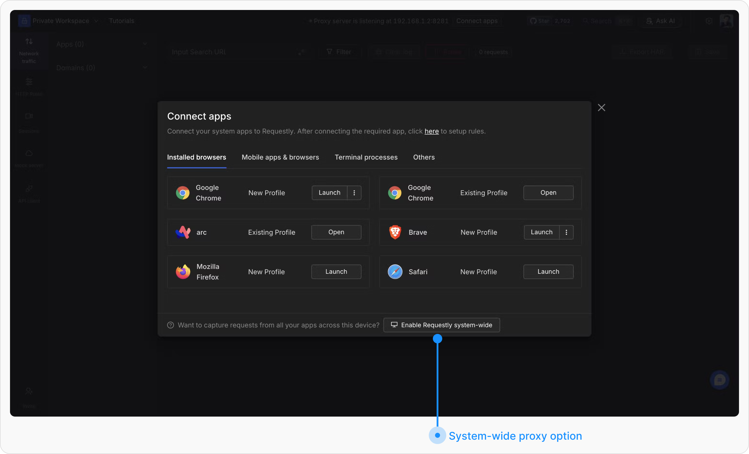 Setting up a system-wide proxy allows you to intercept and debug network requests from all applications on your computer, not just your browser. This is particularly useful in situations where an application-level proxy setup is not available.