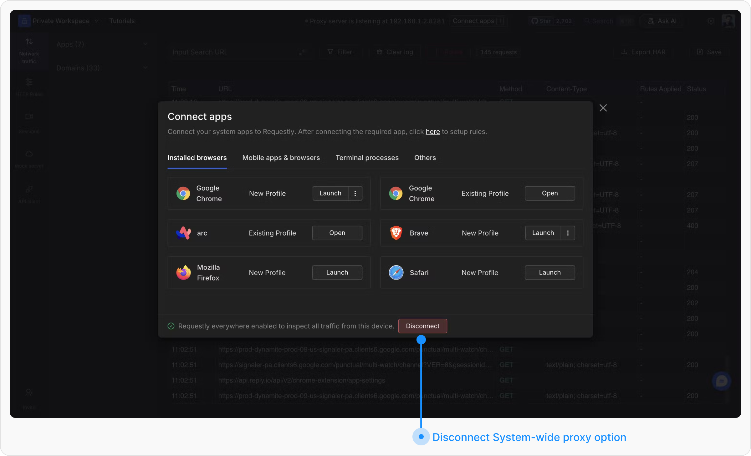 To disable the system-wide proxy, go to the Connect App section in the Requestly Desktop App and click on the Disconnect option to turn it off. This will stop intercepting traffic across your system.