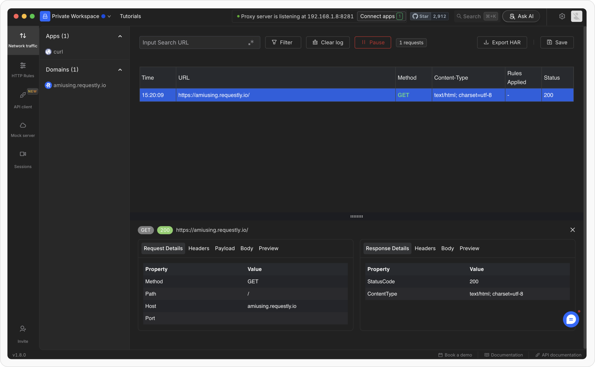 - Now Make a curl request to https://amiusing.requestly.io/ using your terminal and look for that request in the Requestly Network Interceptor.