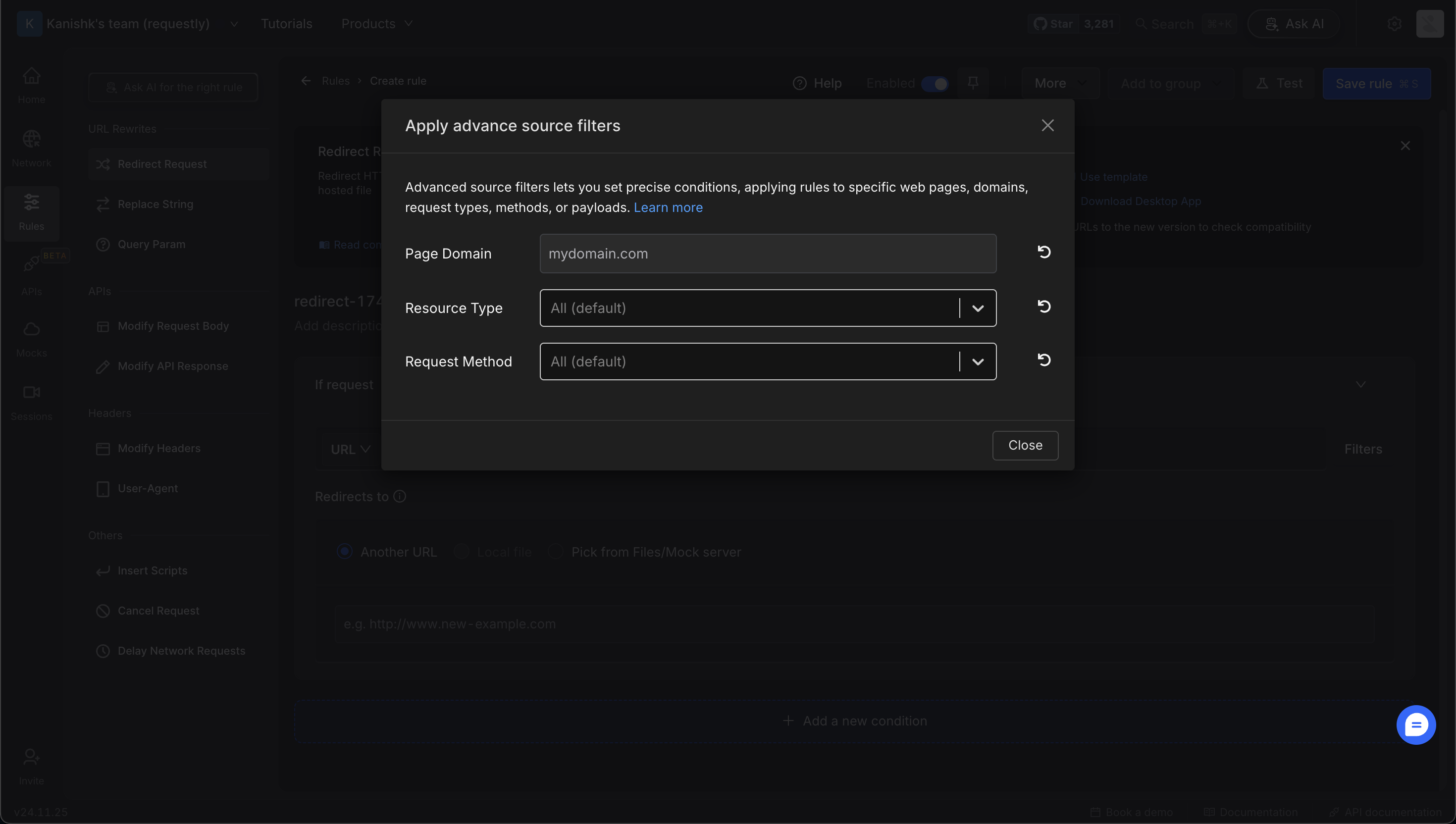 - Page Domain Name: Limit targeting to requests originating from a specific domain. This is especially useful for distinguishing between network calls made from different websites, such as CDN calls shared across multiple domains.
