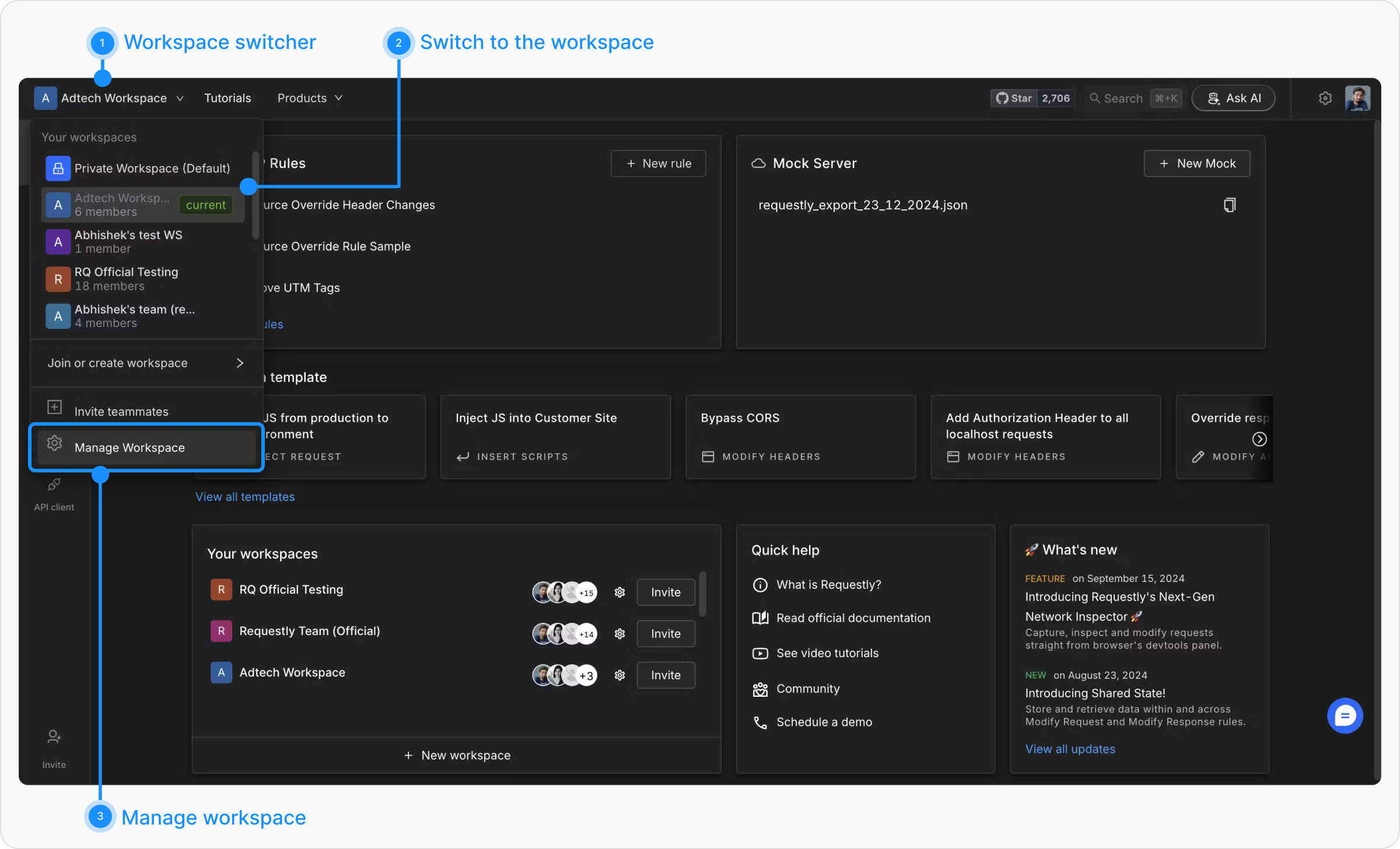Switch to the desired workspace using the workspace switcher dropdown. From the dropdown, open the “Manage Workspace” link.