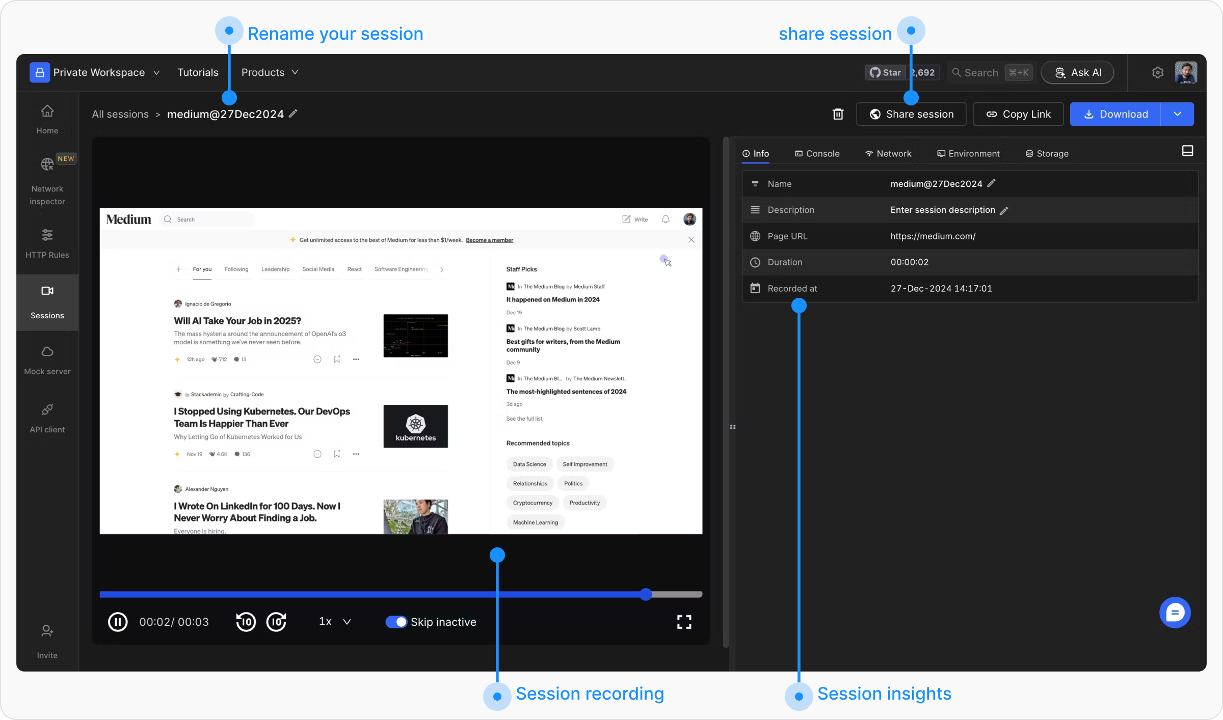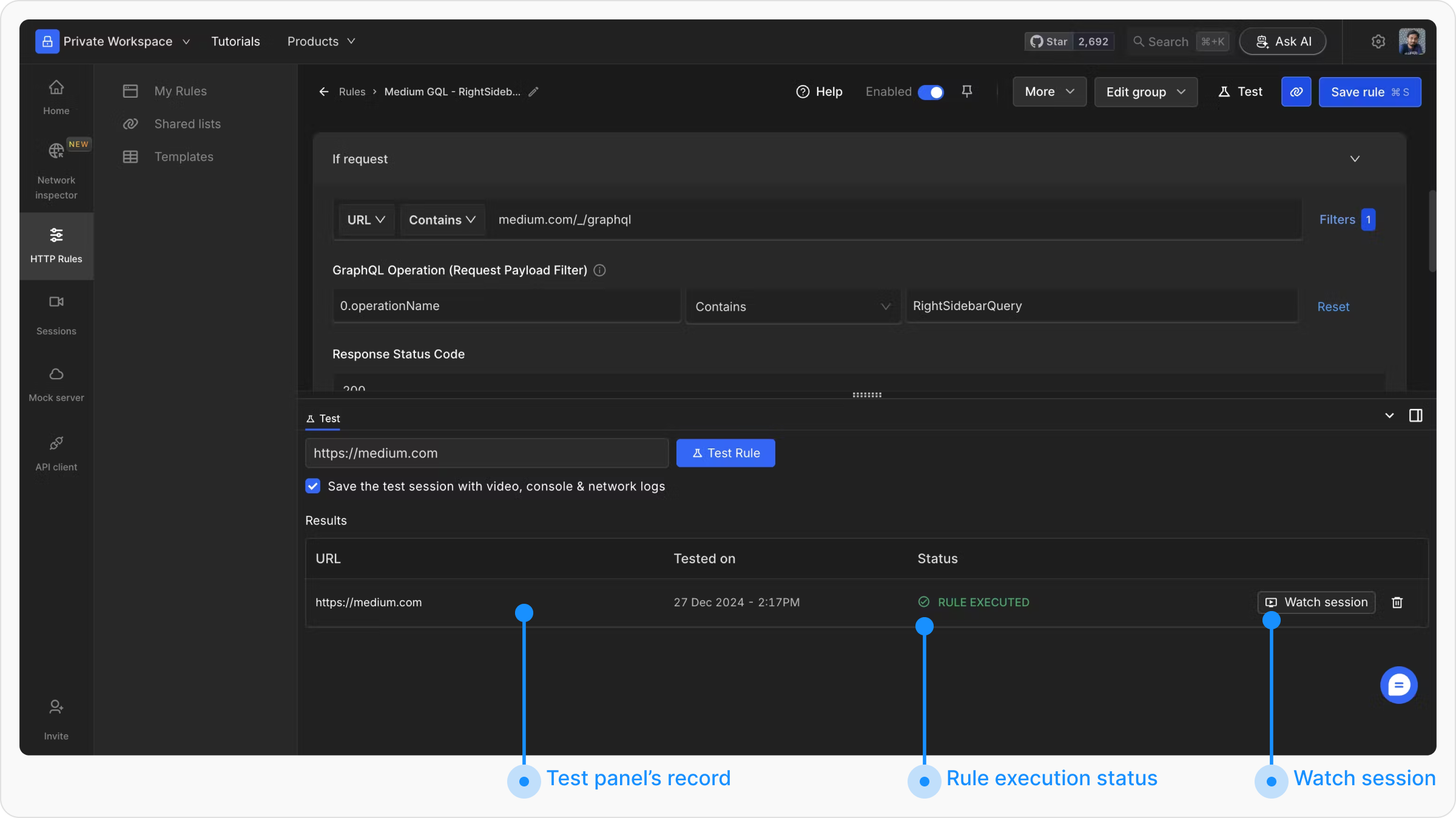 To gain more details about the test report, you can view the network and console logs of the testing session by clicking on the Watch Session button. Requestly maintains reports for the last three tests you’ve run for each rule. Learn more about the sessions here.