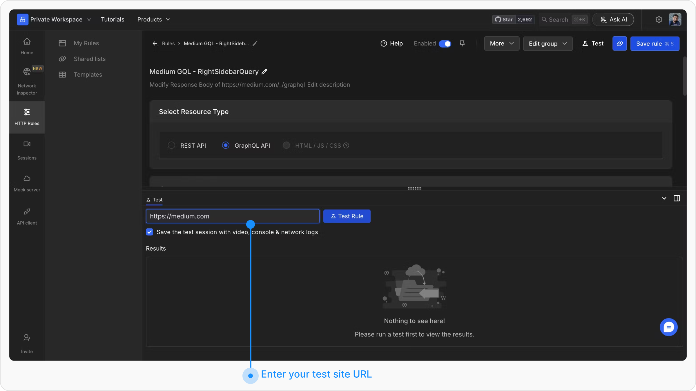 Enter the URL of the webpage where you expect to apply your rule, and click the Test Rule button. Additionally, you can check the Save the test session with video, console & network logs checkbox if you want to capture session details during the test for deeper analysis.