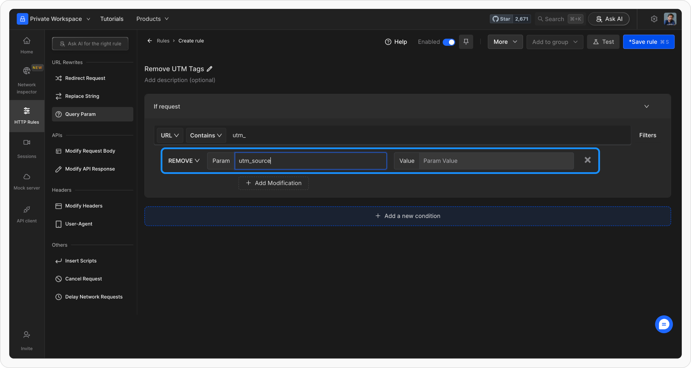 Using Requestly, you can modify the query parameters (query params) sent to the server. This includes adding new query params, updating the values of existing params, or removing specific or all query params from the URL. The following sections explain the steps and common scenarios for modifying query params.