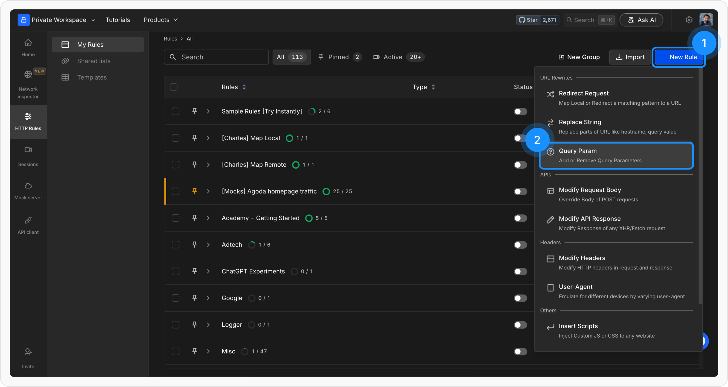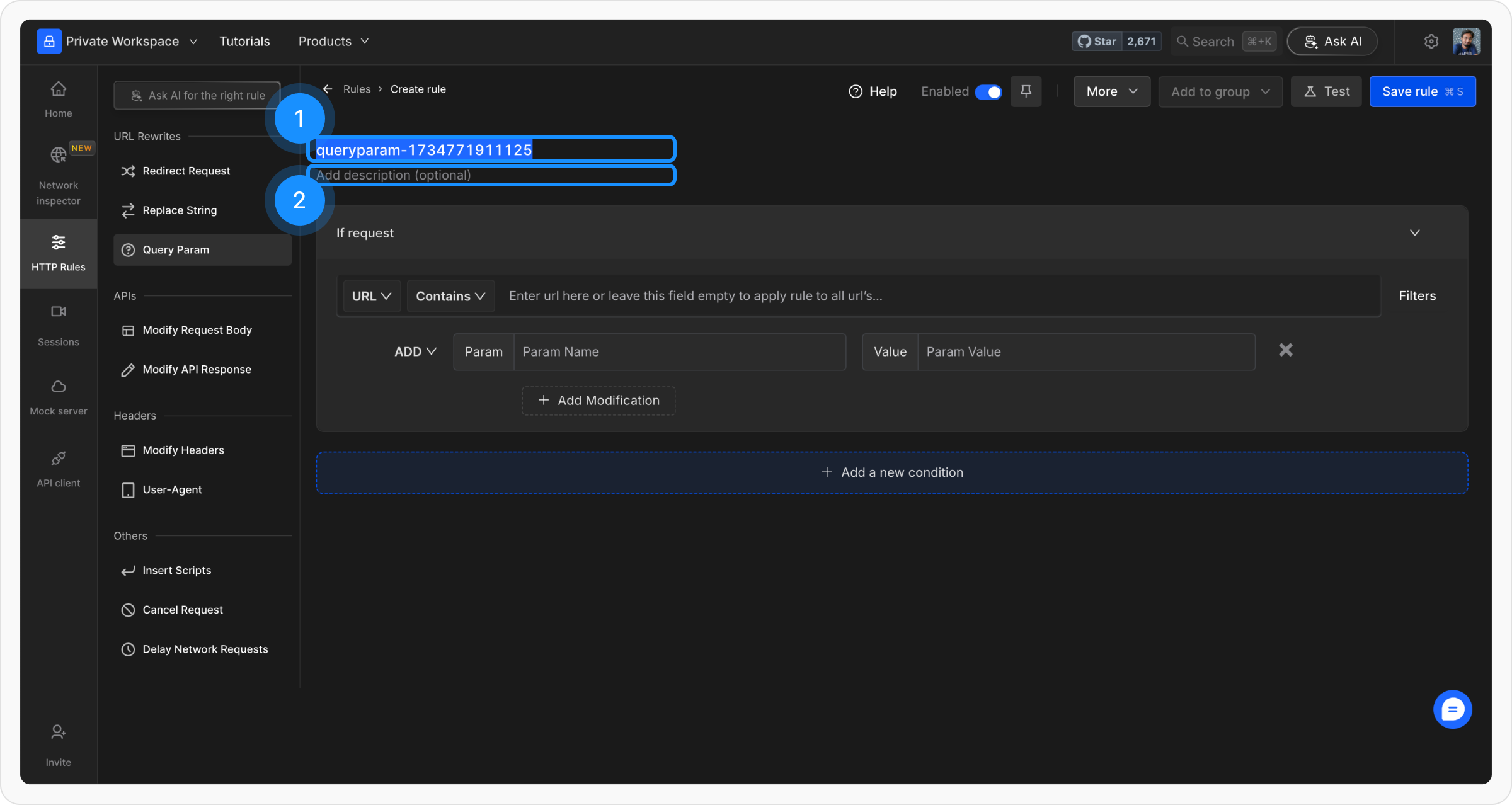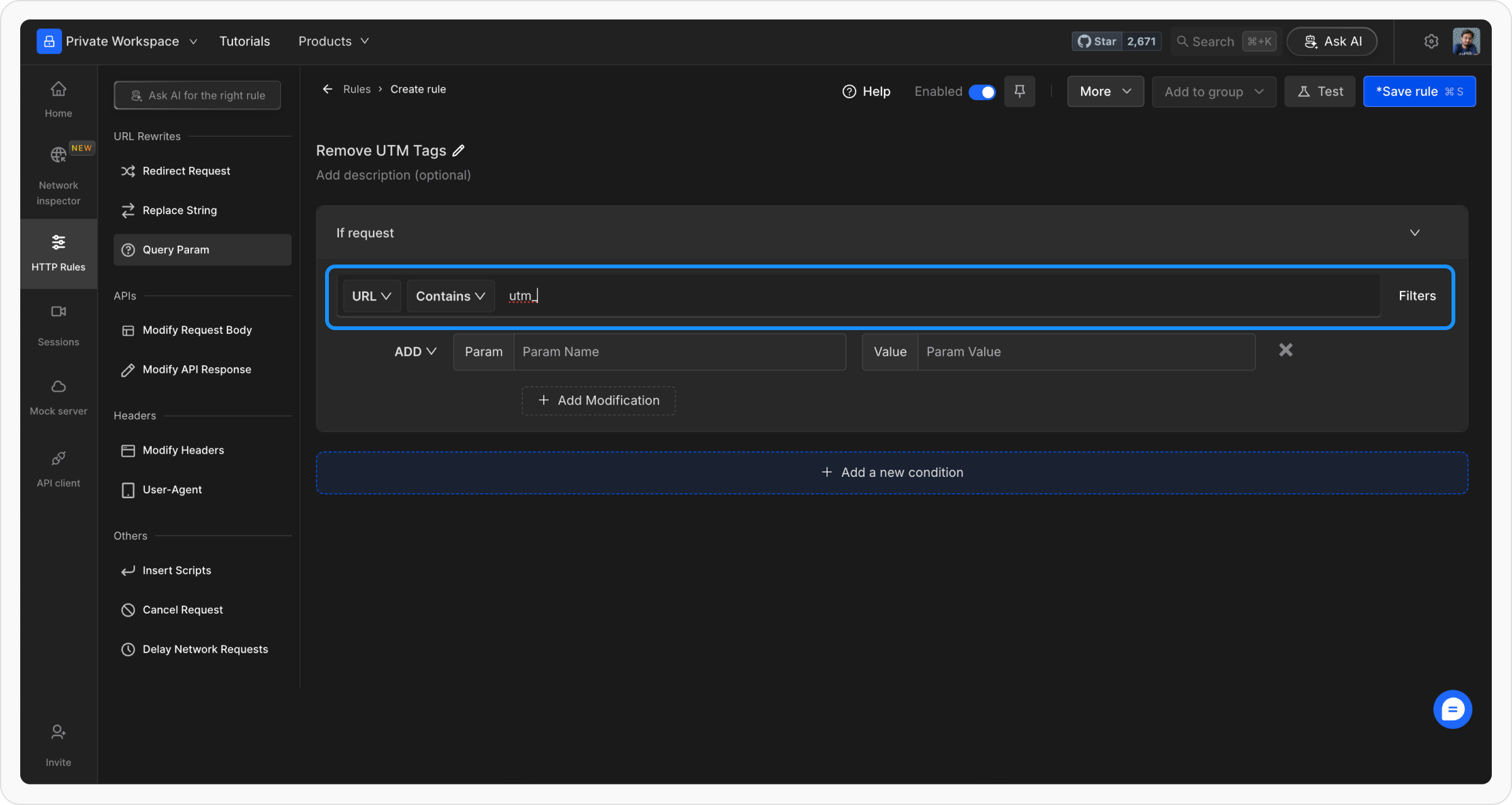 Navigate to the HTTP Rules section in the Requestly web or desktop app. Click on the + New Rule button and select Modify Query Params from the list of options.