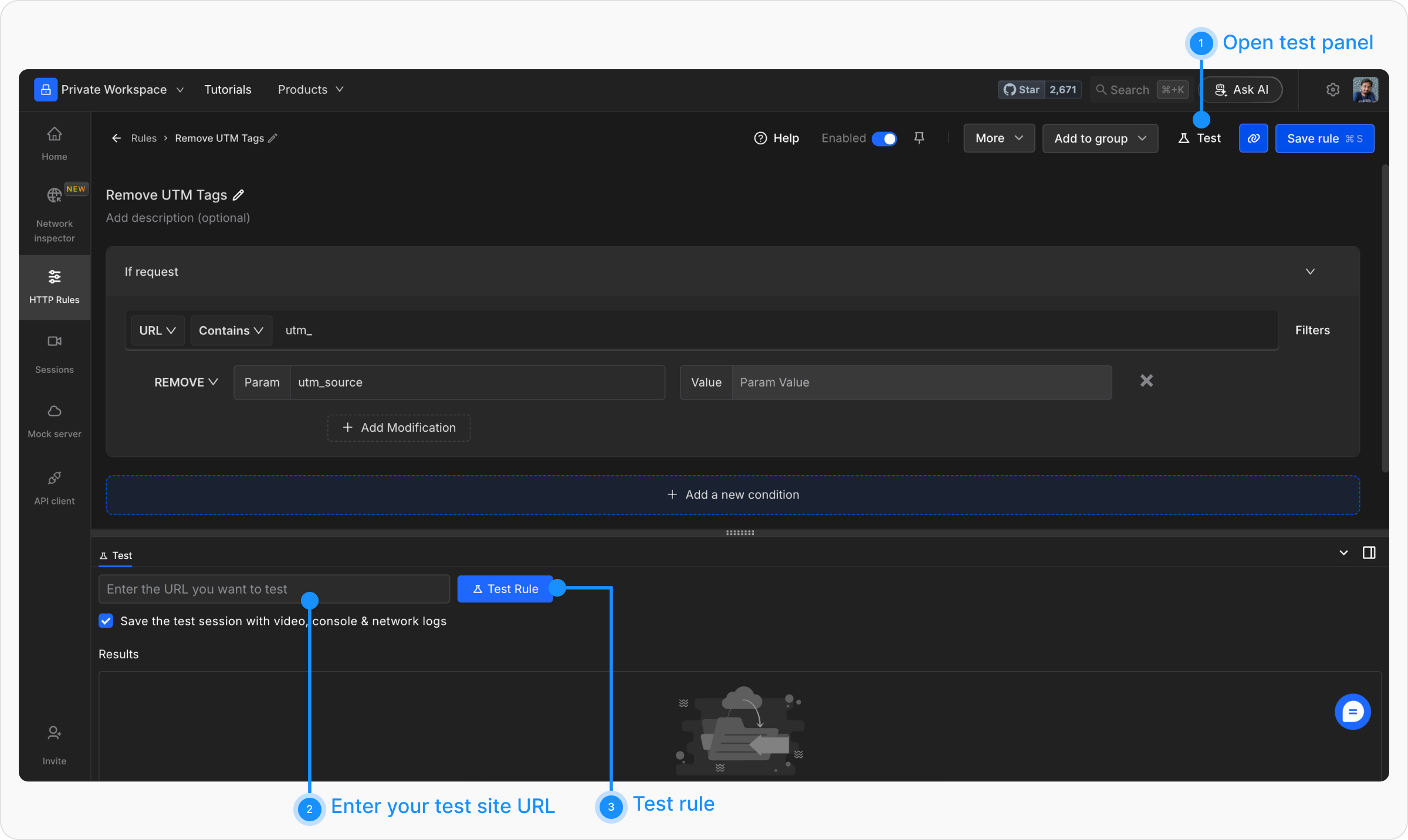 Provide a descriptive name for the rule to keep your setup organised. Optionally, add a description to explain the purpose of the rule for easier identification.For example, a name like Remove UTM Tags can help quickly understand the rule’s objective.
