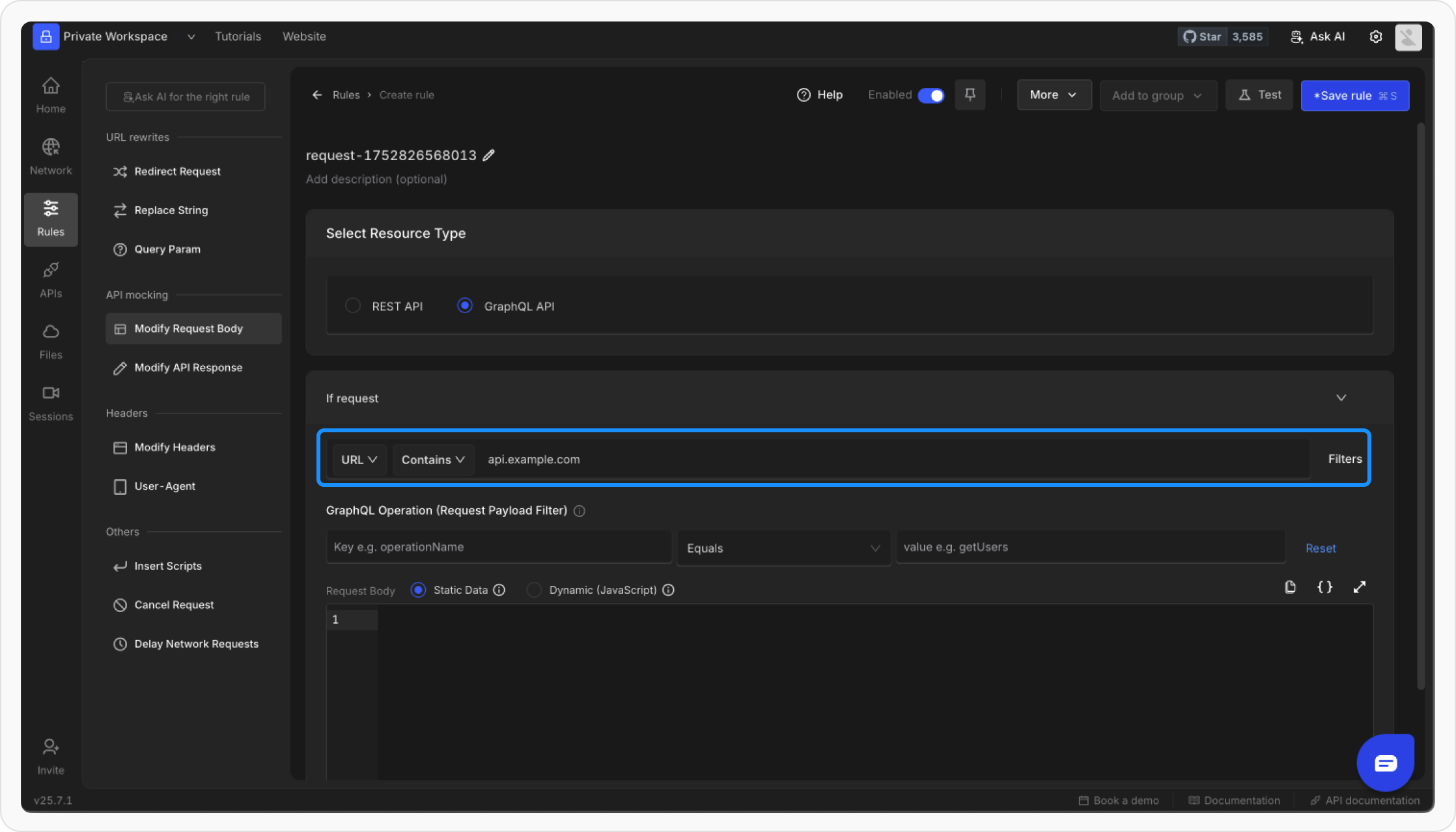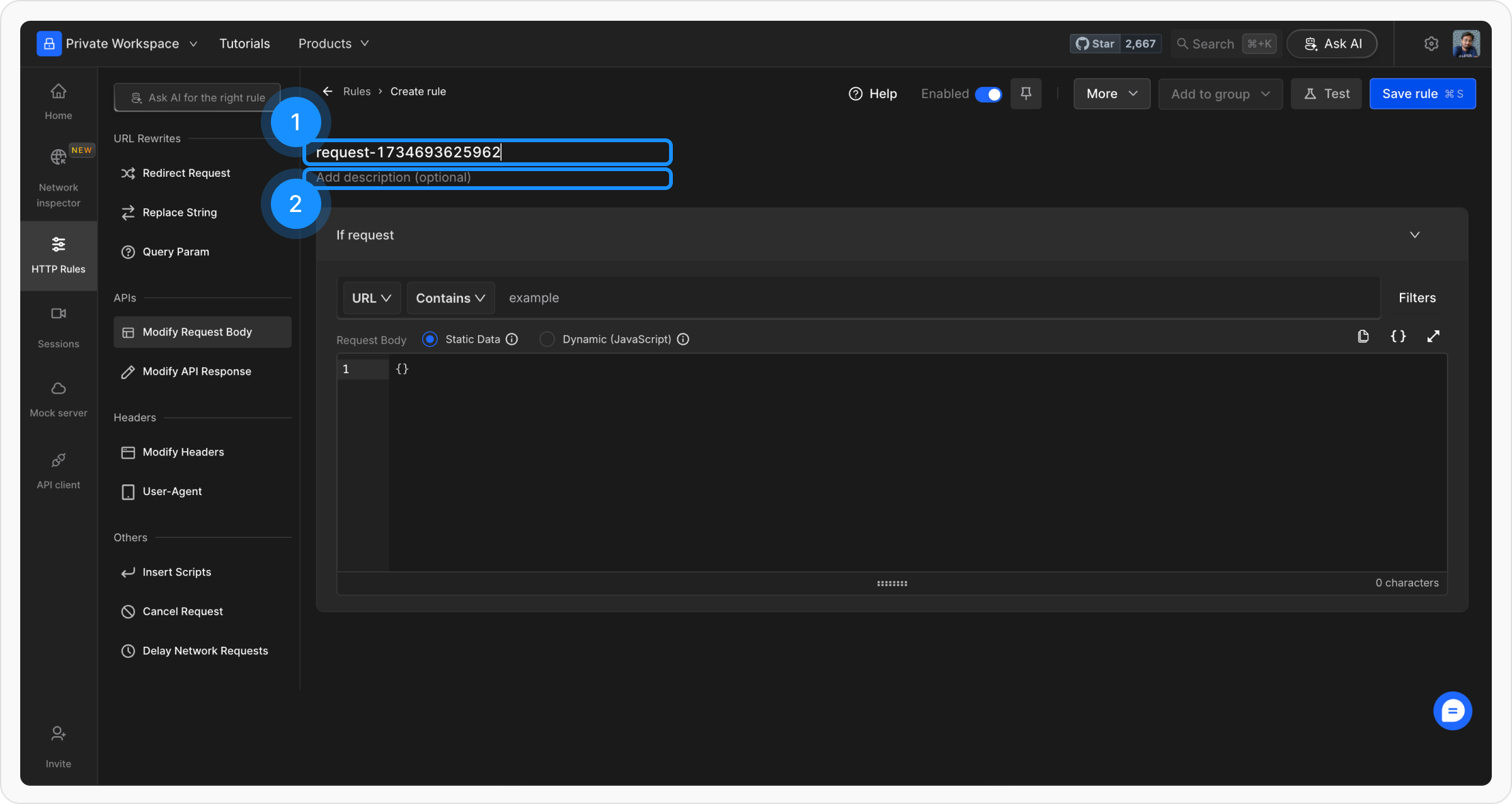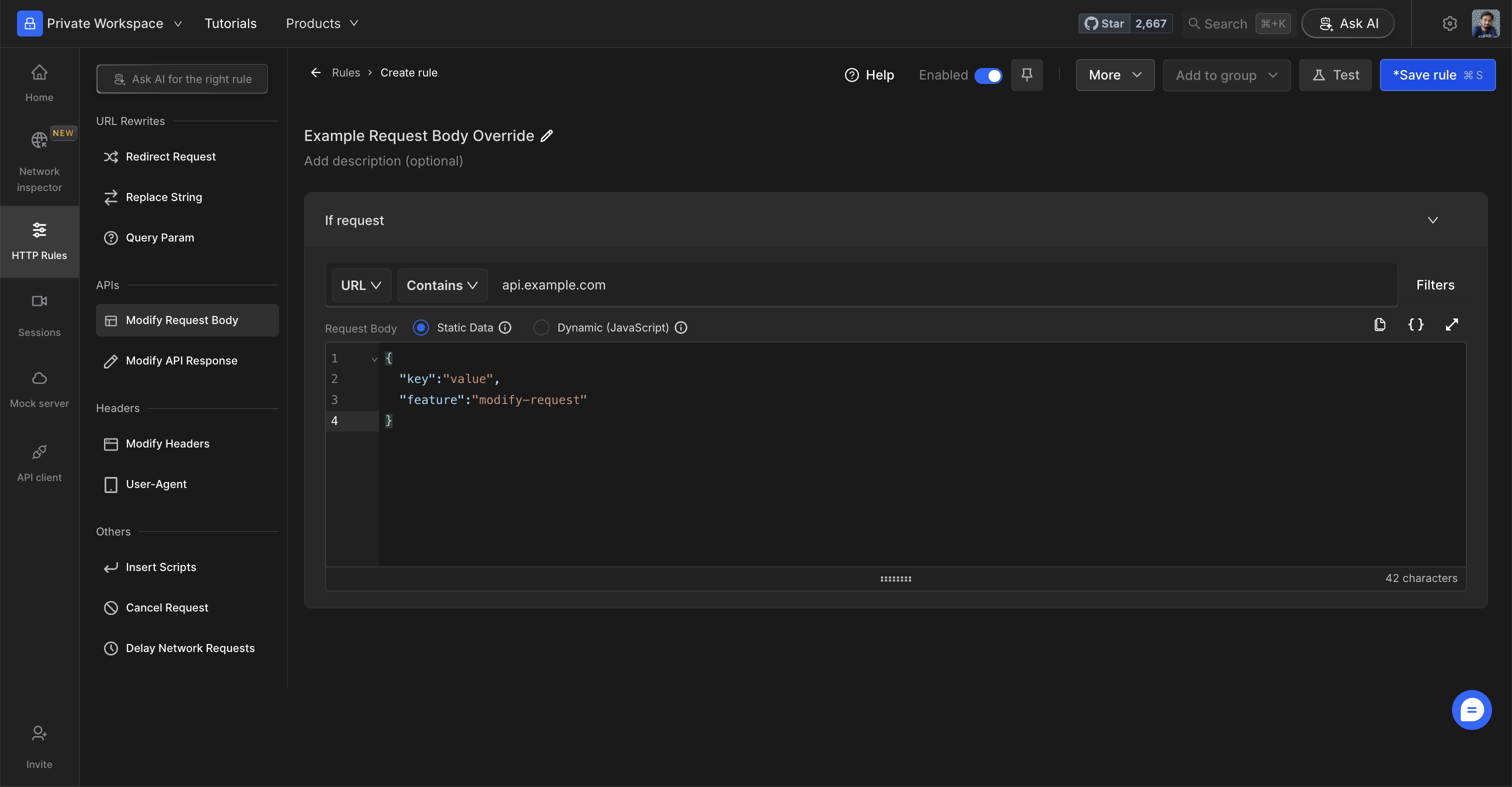 The Modify Request Body rule enables you to override or programmatically modify the data sent to the server in an HTTP request body. This rule is particularly useful for debugging, testing, and dynamically altering API payloads.