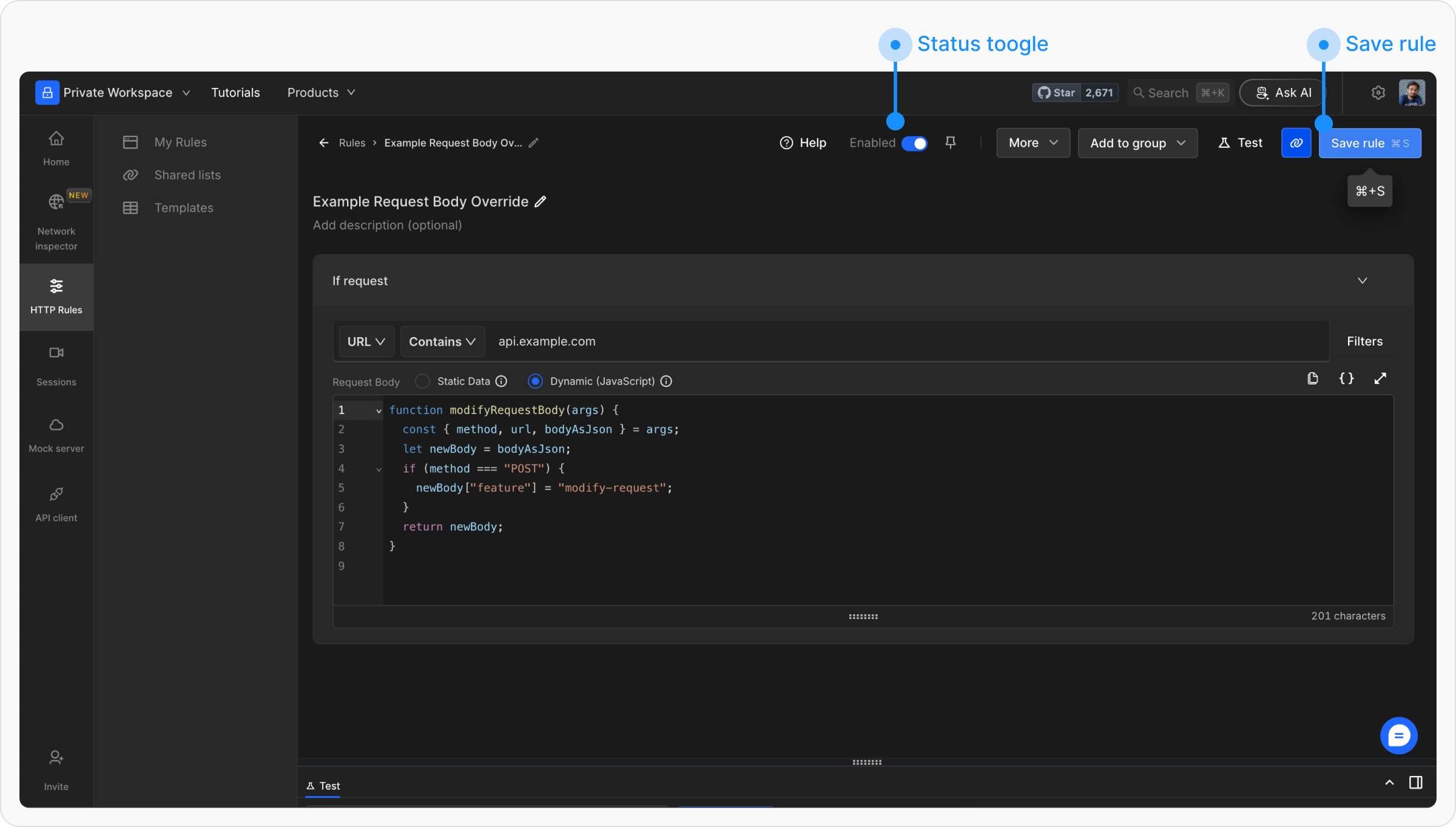 - Programmatic Request Body Modification: Dynamically modify the request payload using JavaScript based on specific conditions.