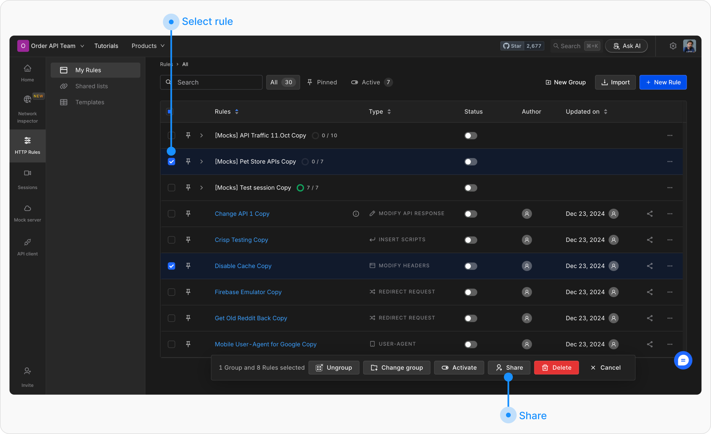 Go to HTTP Rules, and open “My Rules” from the left sidebar. Identify the rules you wish to share by selecting them from the rules table. Use the checkboxes provided to choose one or multiple rules simultaneously.
