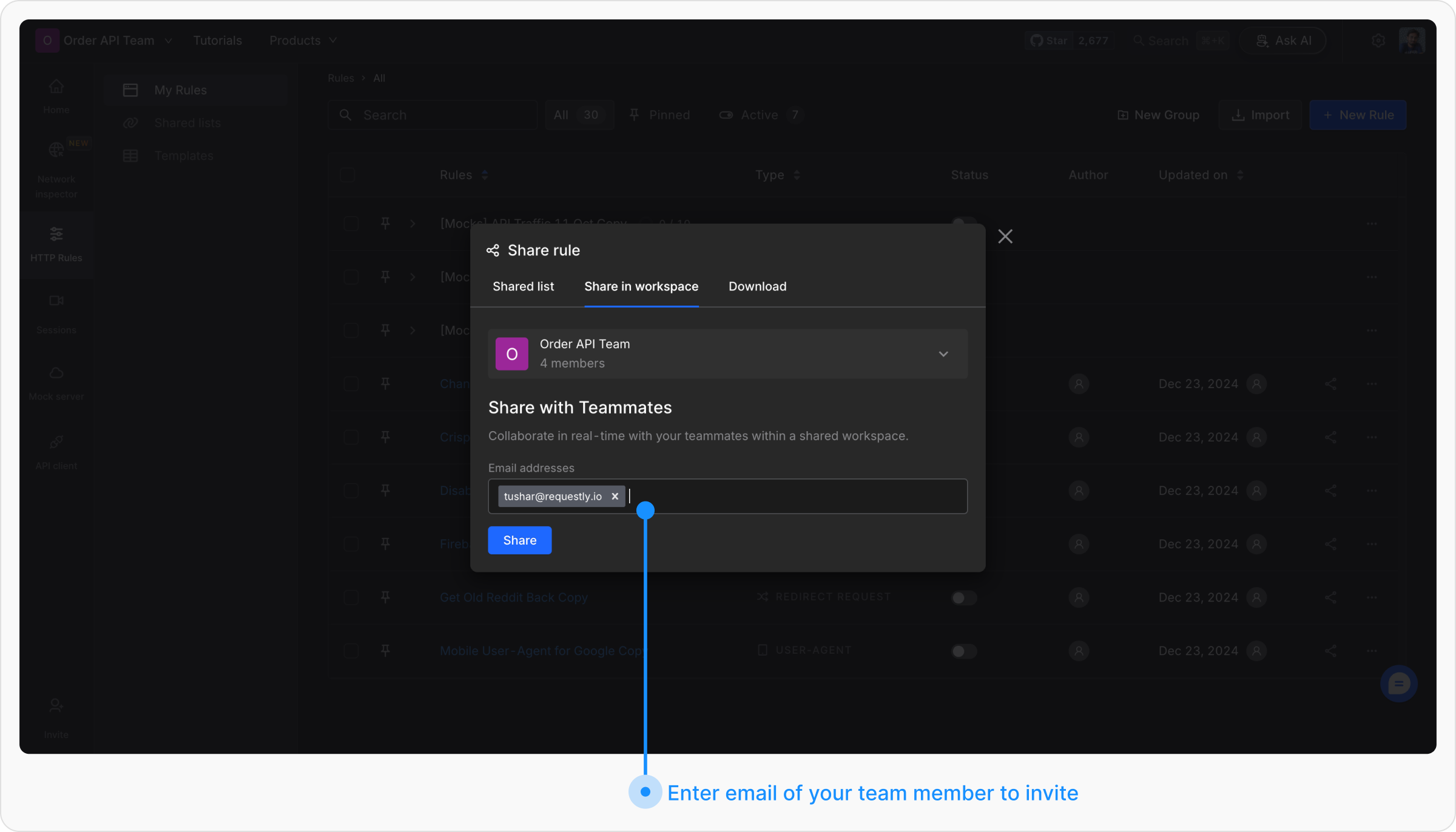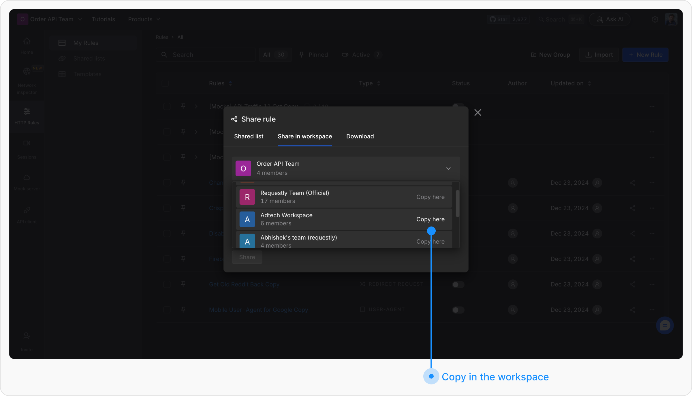 In the Share modal, switch to the “Share in Workspace” tab. Here, you have the following options:Copy to a Different WorkspaceYou will see a list of workspaces you have access to, and you can click on the “Copy here” link next to a workspace to copy the selected rules to that workspace.Invite Users to the Current WorkspaceAdd new collaborators to the current workspace by inviting them via email. They will gain access to all existing workspace rules, enabling real-time collaboration.