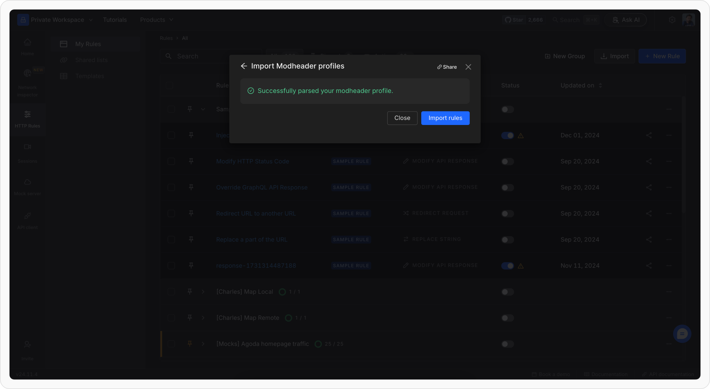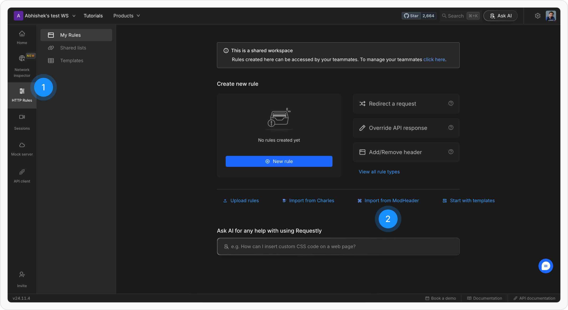 If no rules exist, the Import from ModHeader option will be displayed. Click it to open the import popup.