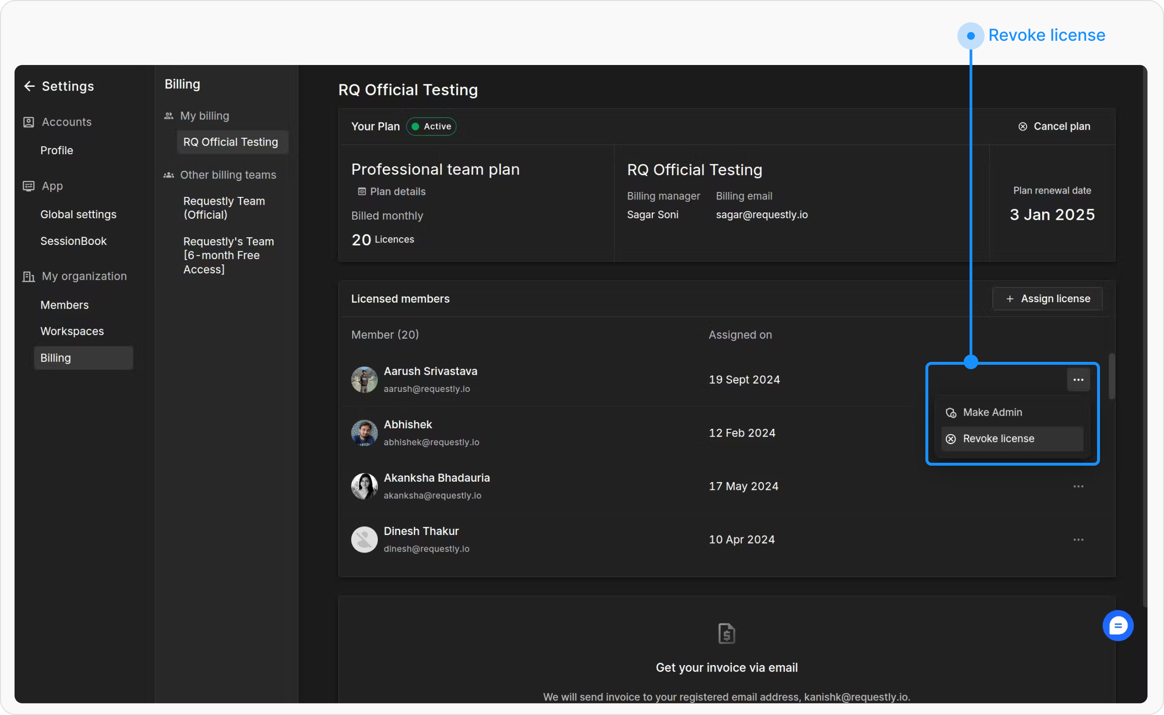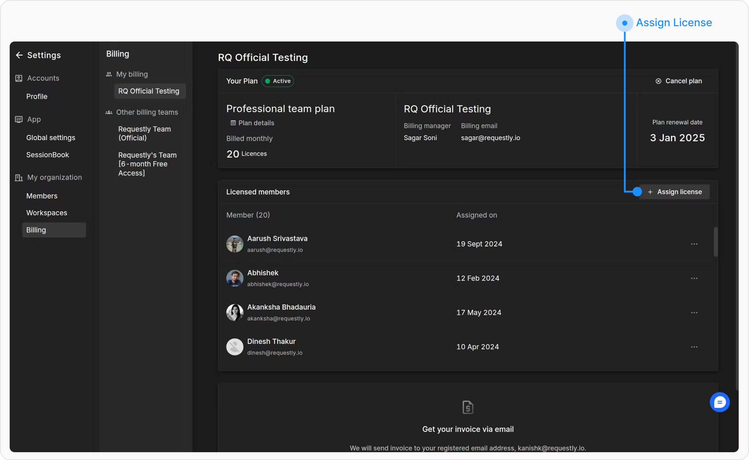 The Billing Dashboard provides a simple way to manage license holders, ensuring your team has seamless access to premium features.