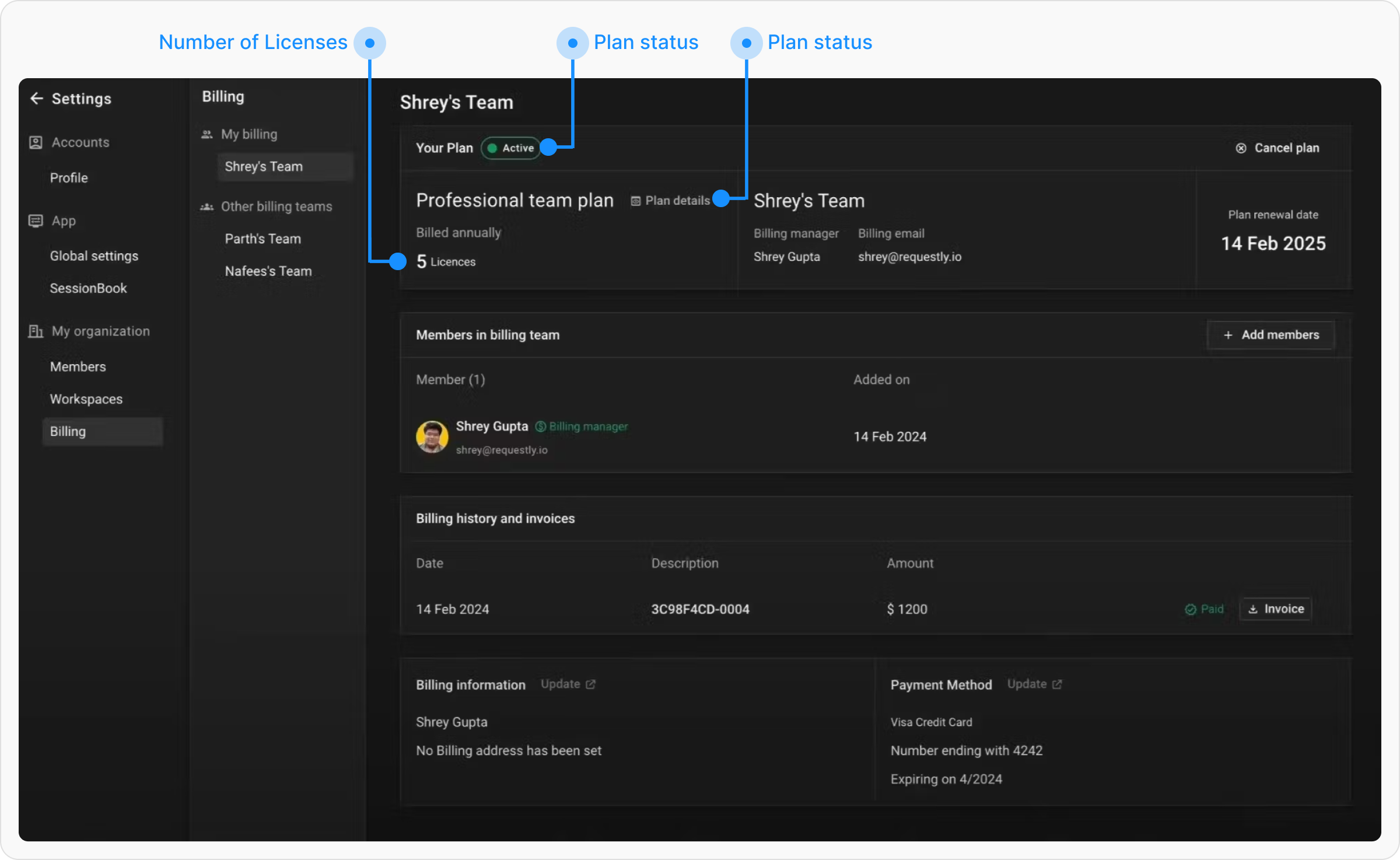 In the Billing Dashboard, you can view the details of your current plan, including the number of licenses purchased and their status.