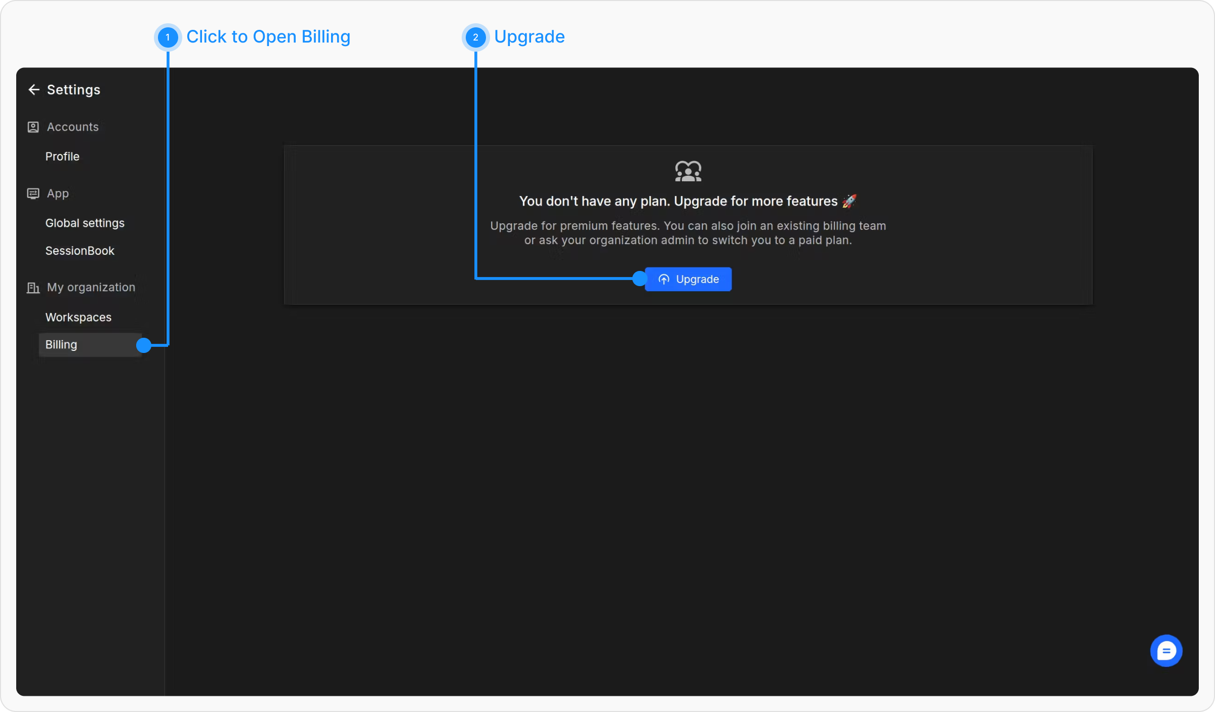 After you open Billing, click the Upgrade button to select your plan and begin the process of allocating seats.