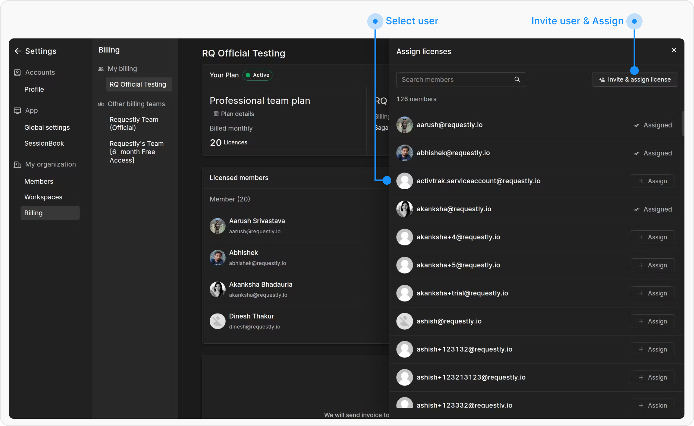 If the user is not listed, use the Invite & Assign License option. Enter the user’s email to send an invitation. Once the user signs up, he will be automatcially assigned a license.