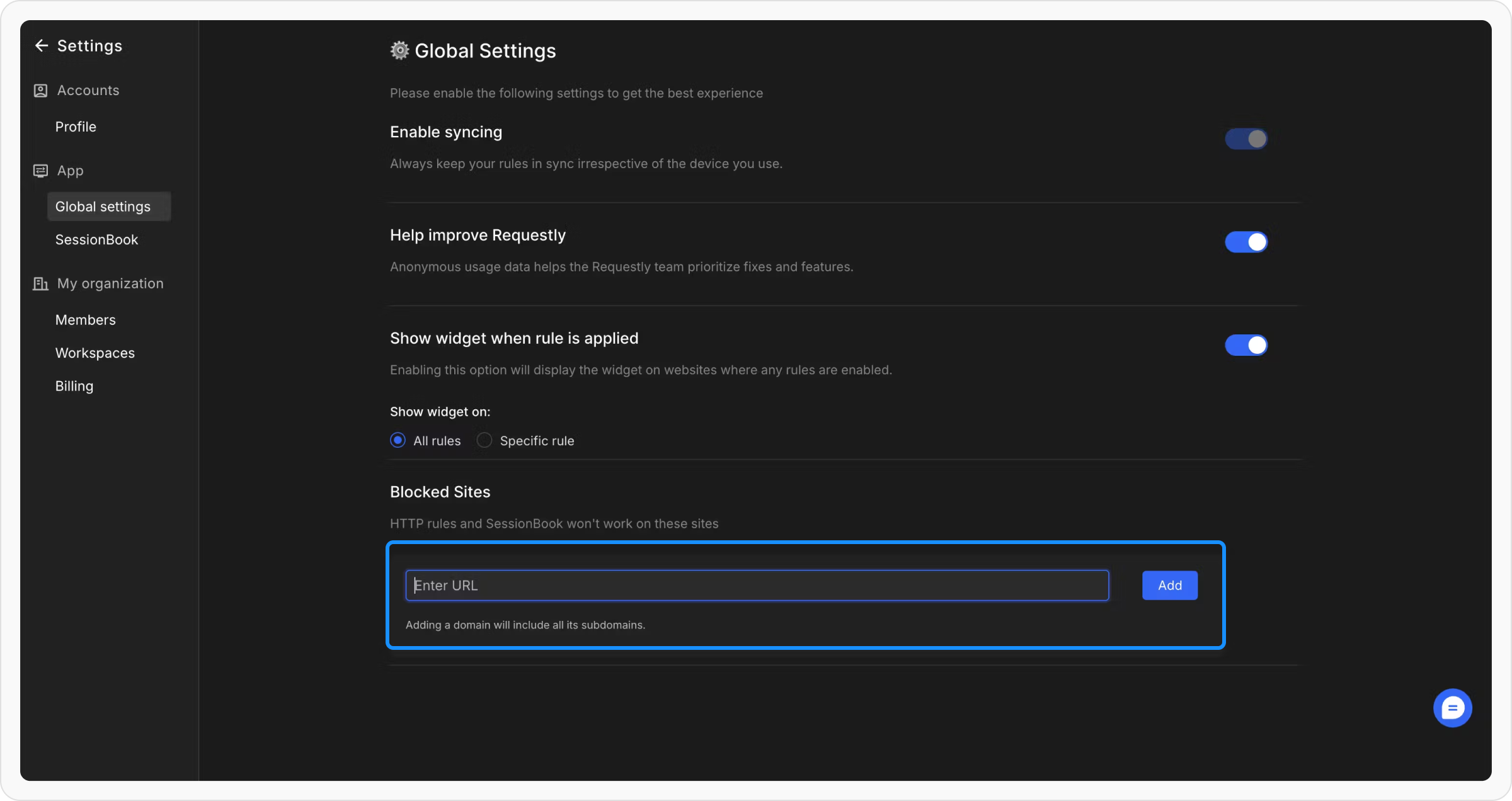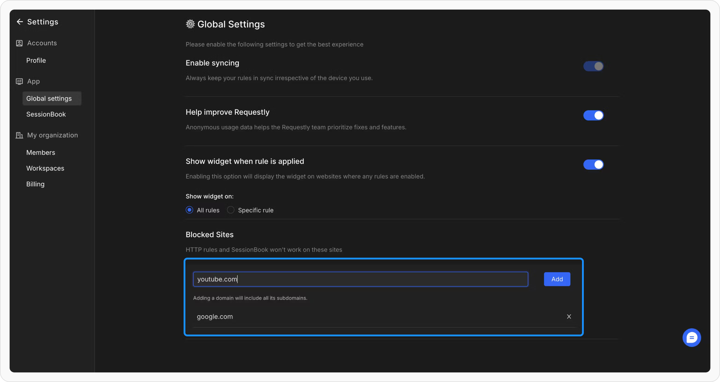Blocklist in Requestly allows users to disable the Requestly Extension for specific websites. This feature ensures that certain sites remain unaffected by Requestly’s modifications, making it particularly useful in sensitive or problematic scenarios.