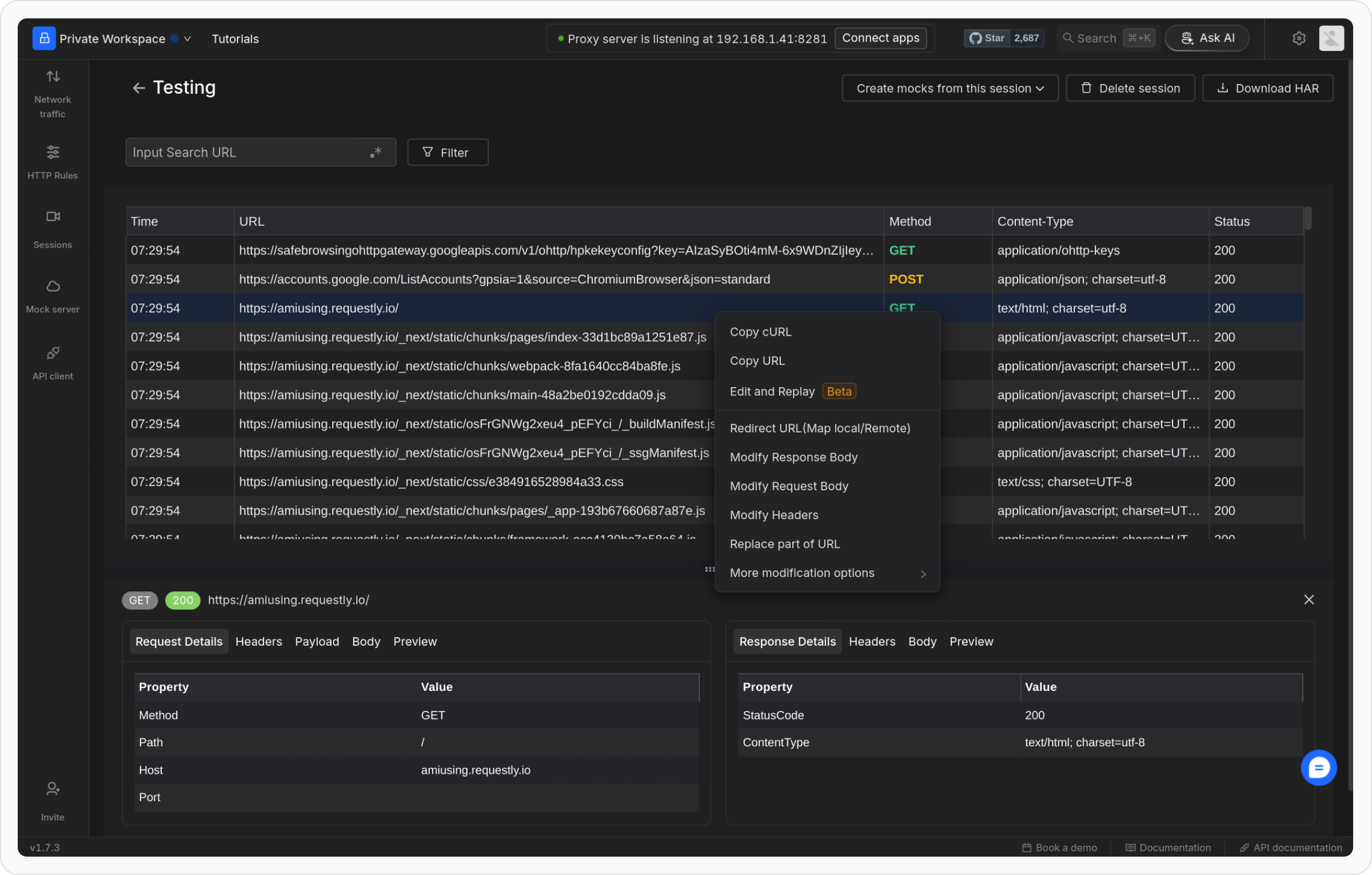 You can keep your session data for later use or share it with others. Use the Export HAR option to download session data, which can be shared or re-imported into Requestly. To learn more, visit the Import/View HAR file page.Creating Rules from Captured Sessions