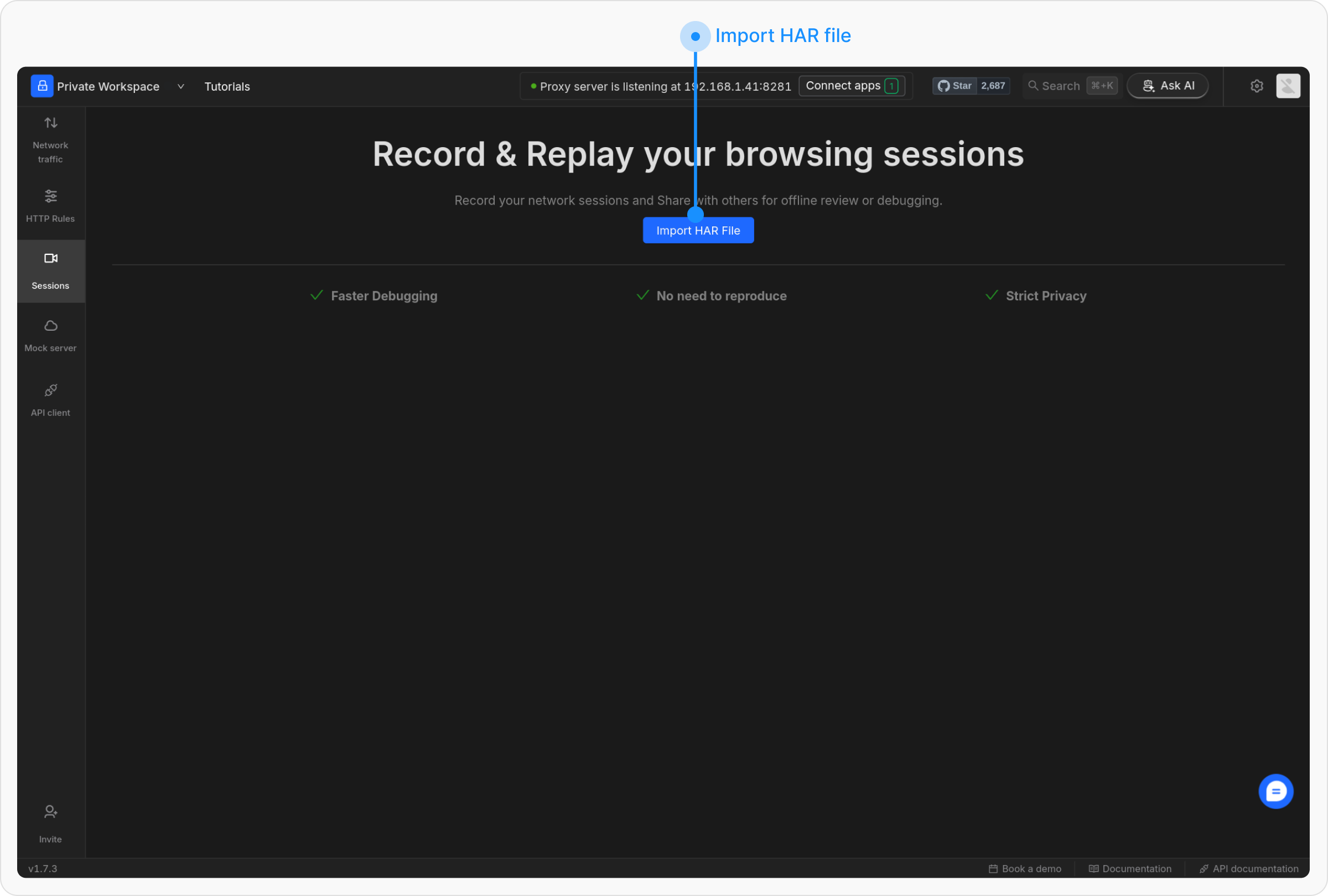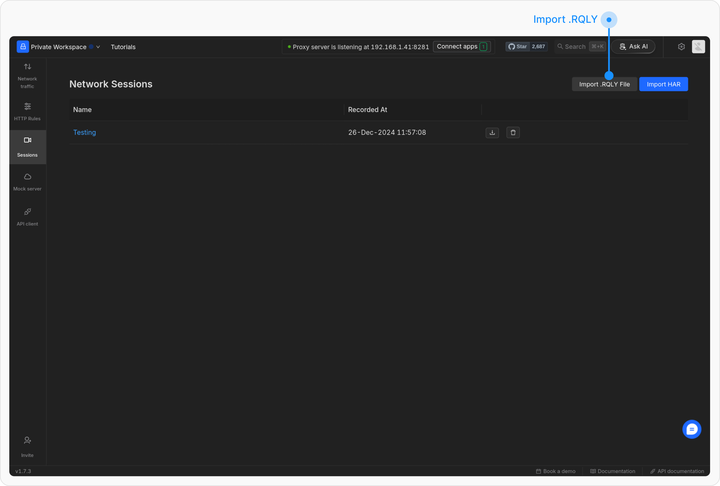 Another method is to import a HAR file, which can be generated from various sources, including browser network sessions, other interceptors, or even Requestly’s traffic interceptor. Follow these steps:Import a .rqly File