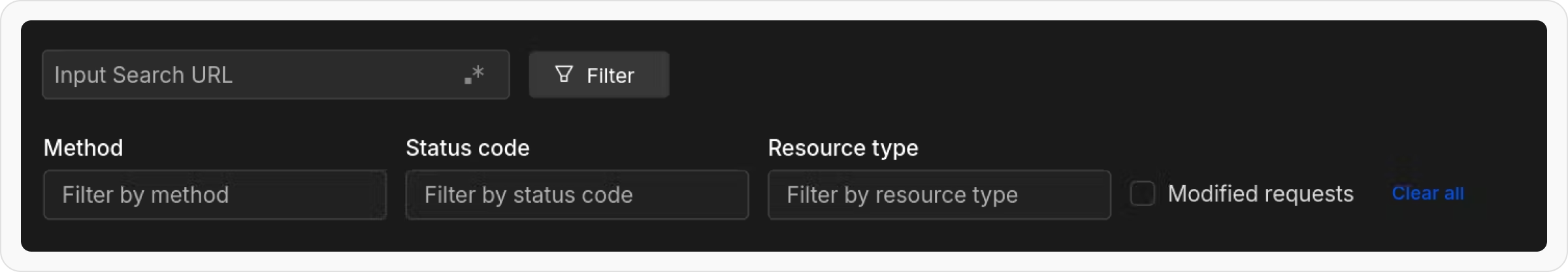 - Search URL: Look for specific requests by entering part of the URL, a wildcard, or a regular expression.