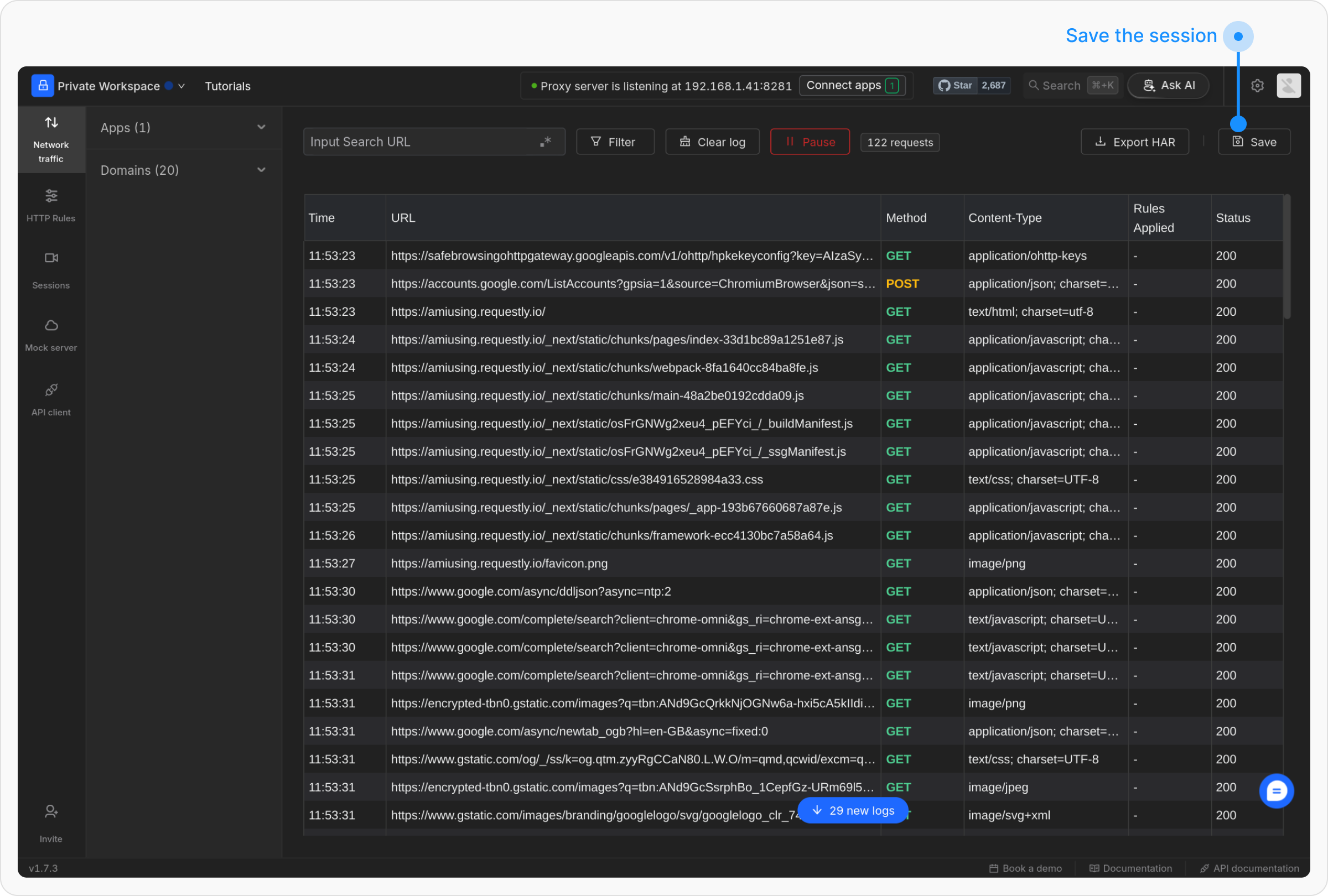 Create multiple mock responses at once to save time and simplify your testing. This feature lets you simulate different backend scenarios, speeding up both development and testing. With Bulk Mocking, you can quickly create mock responses for selected requests in a session, streamlining your workflow. Once your mocks are created, you can view and manage them easily. For more detailed instructions, check out our Bulk Mocking Guide.Saving and Sharing Sessions