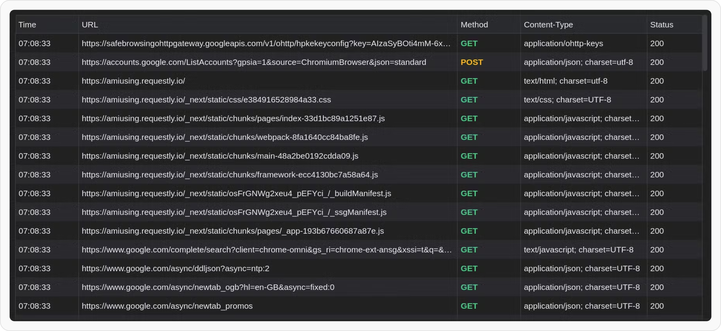 text/css,application/json). - Status: The HTTP response status code (e.g., 200, 404).