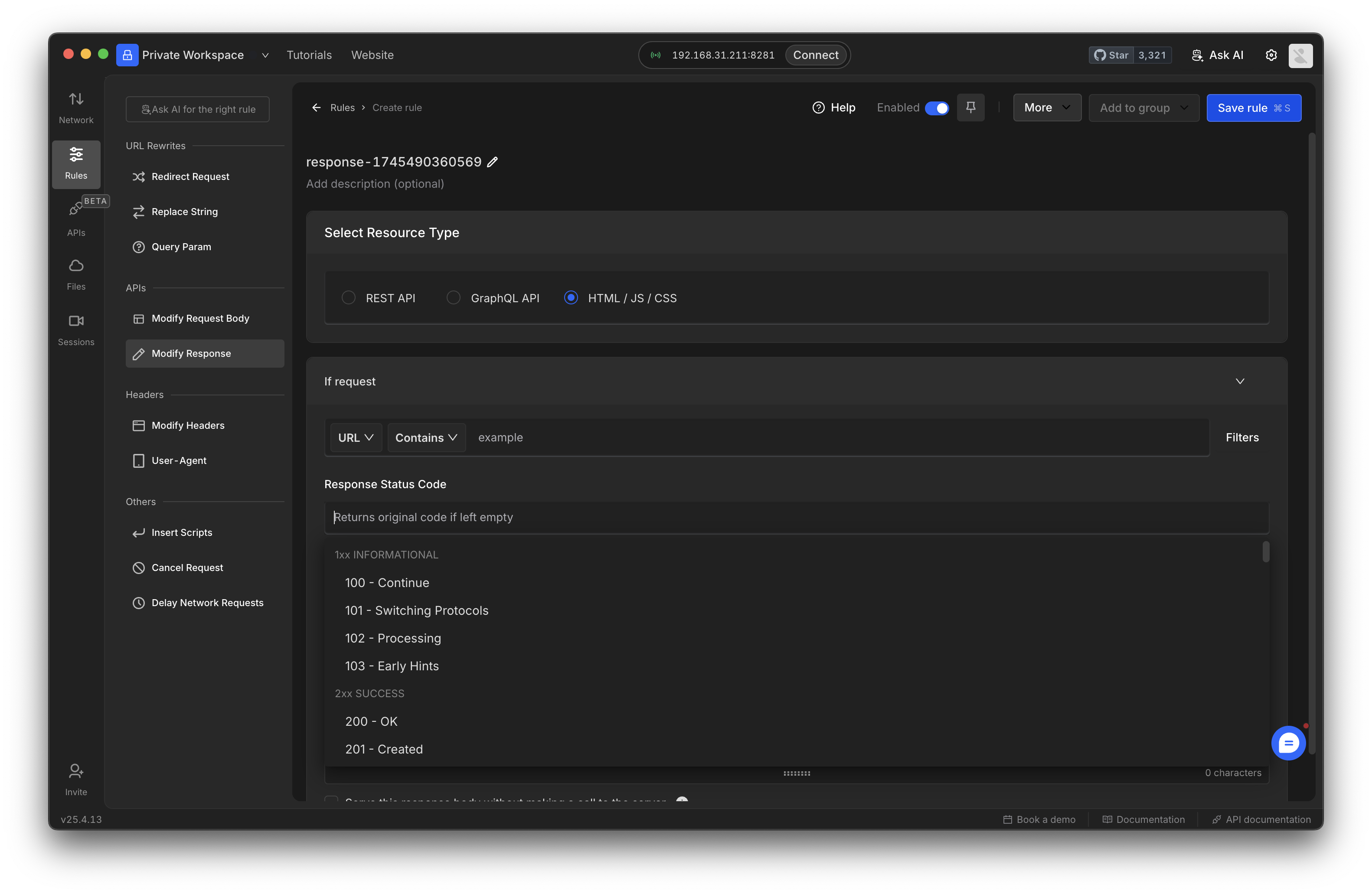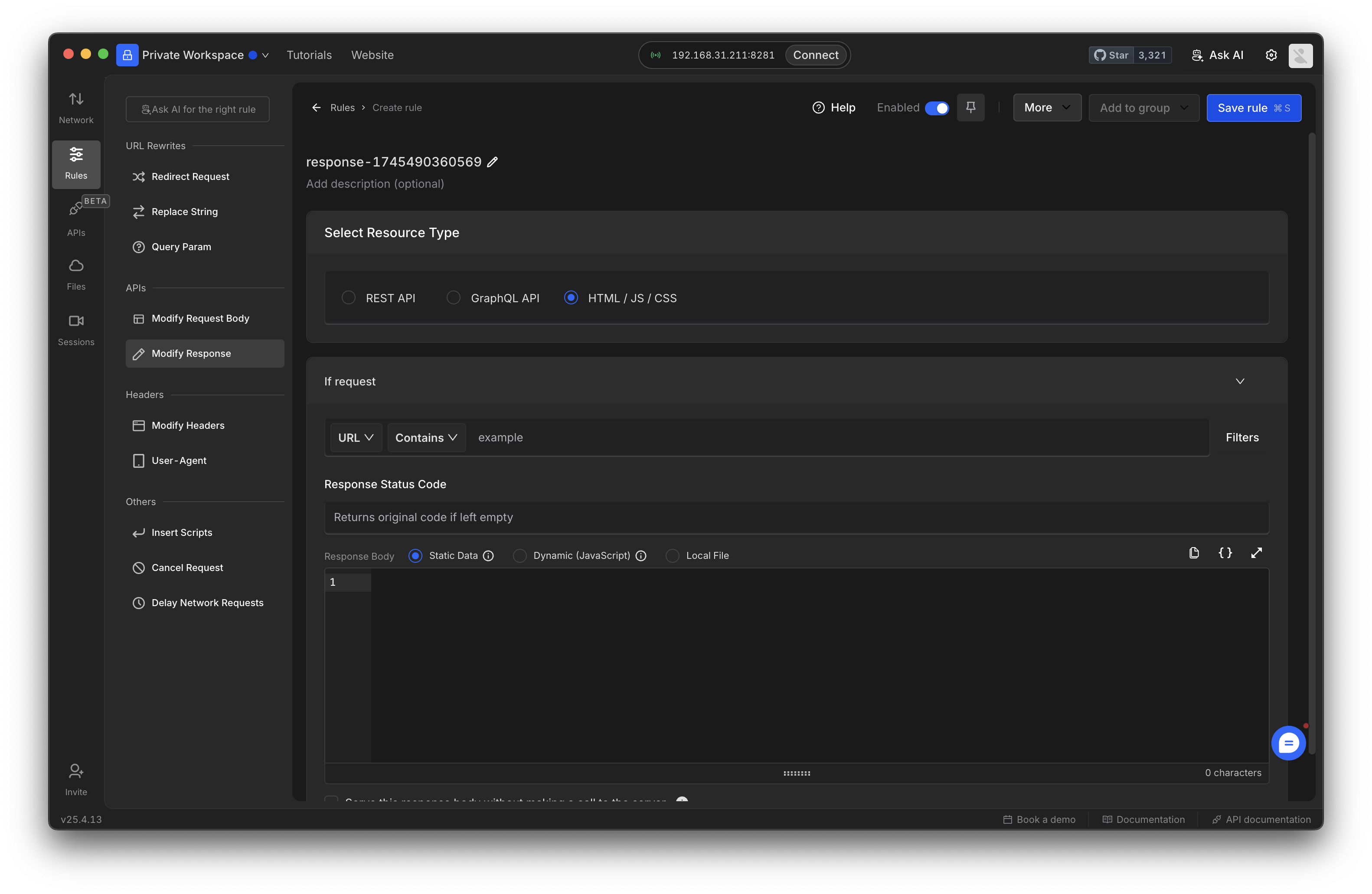 Dynamic Modification Script (JavaScript): Use JavaScript to modify responses dynamically. The script provides access to parameters like: