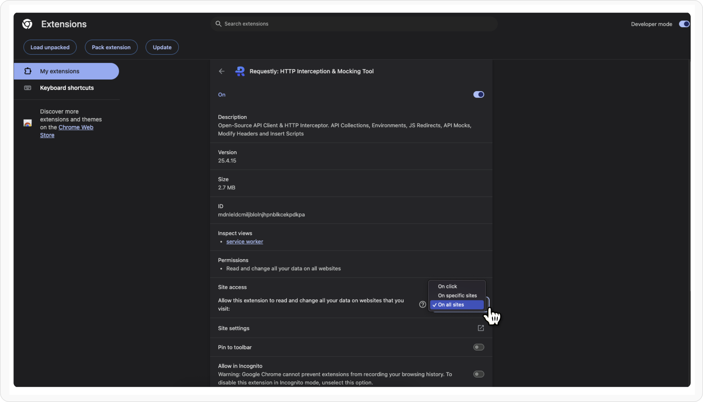 Under Site access, choose “On all sites”.