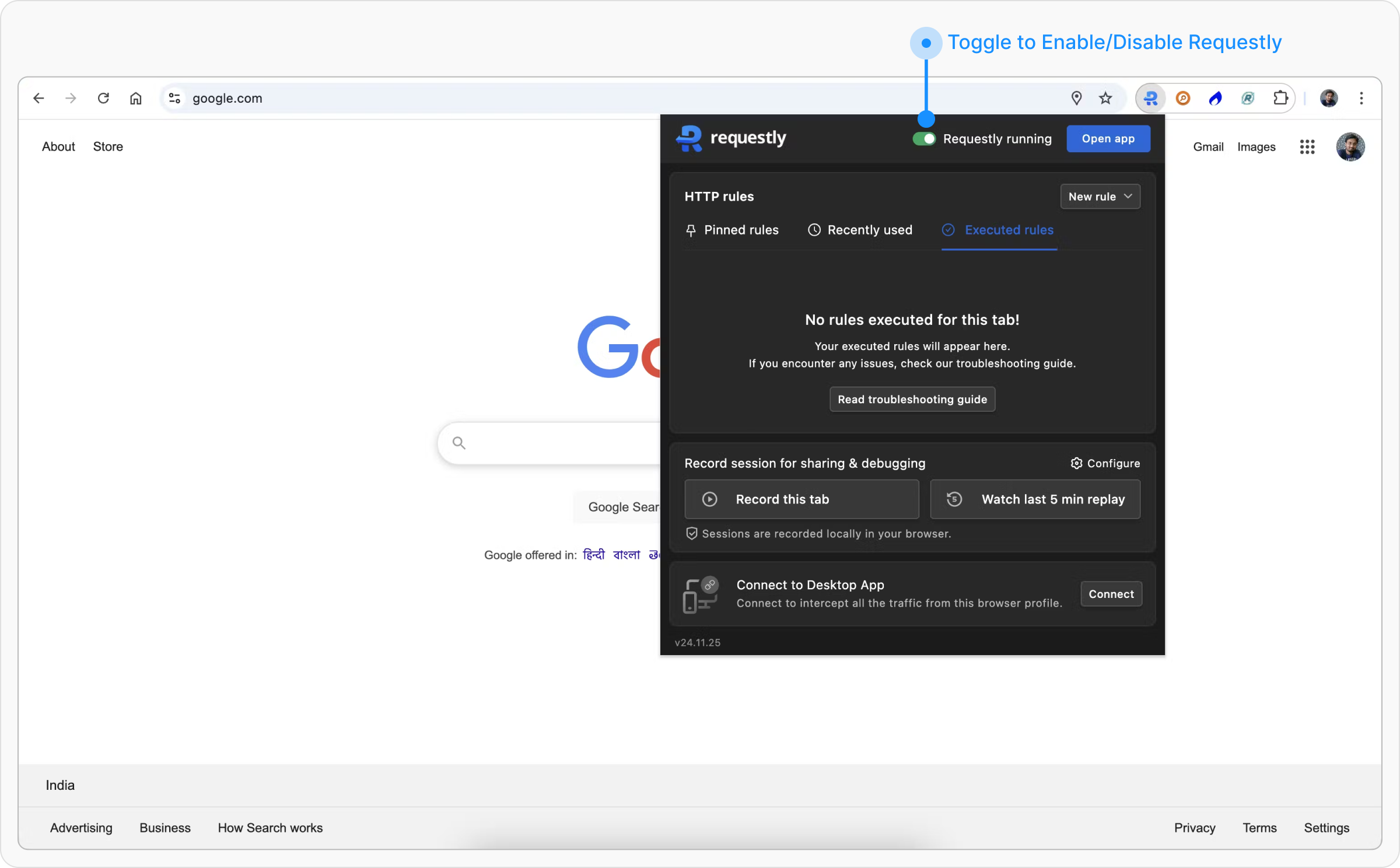 Locate and click the Requestly icon in your browser’s toolbar to open the menu.