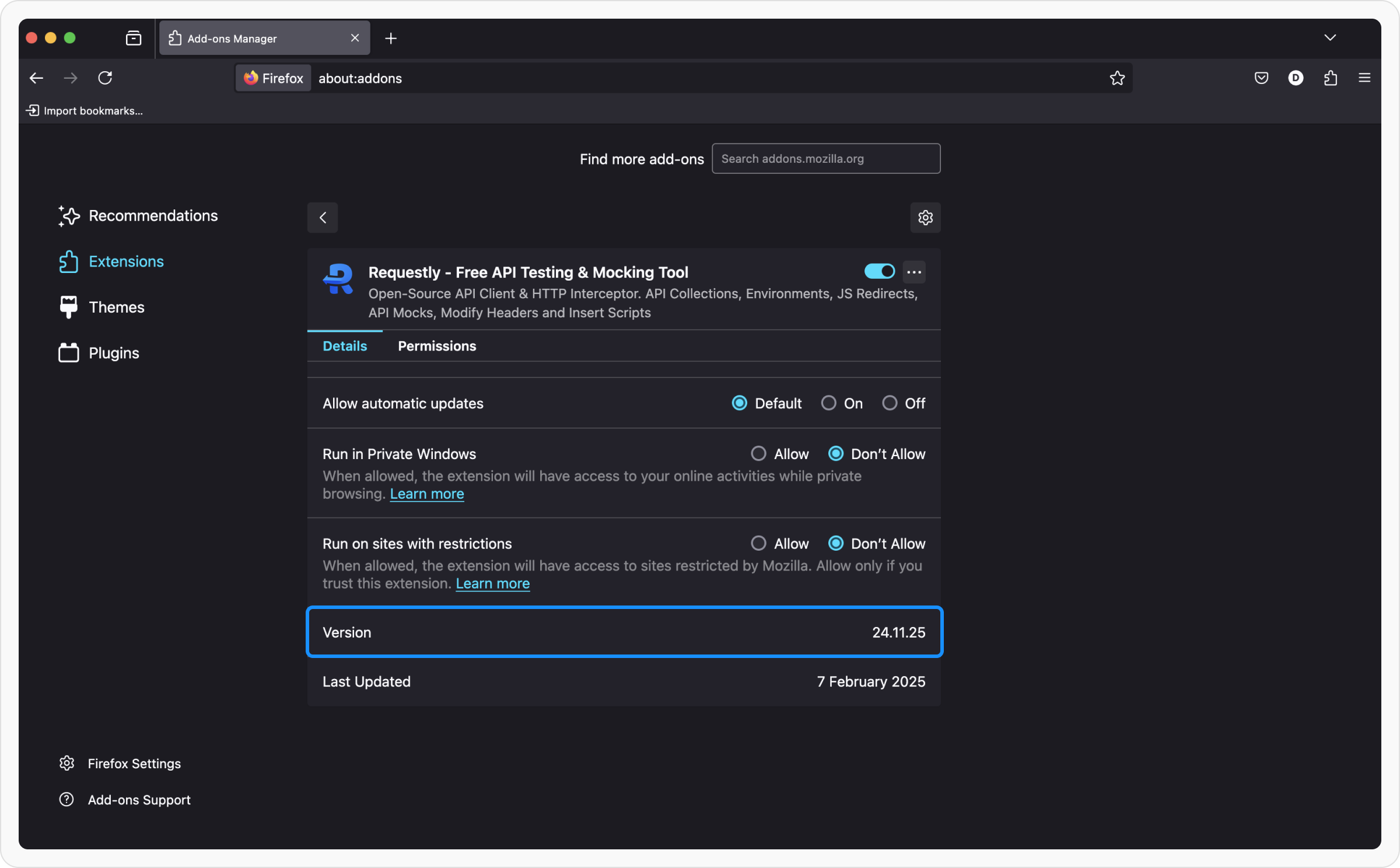 • Mozilla Firefox: Open about:addons, find Requestly, and check the version.